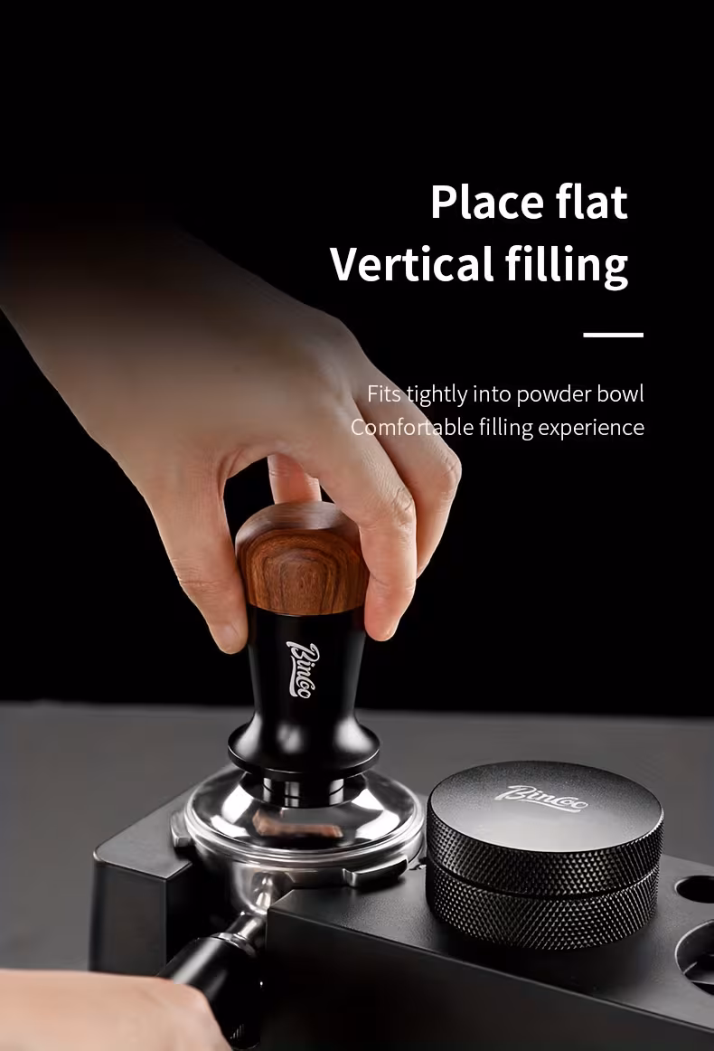This espresso hammer combines natural wood craftsmanship with a threaded compression design that stabilises tamp pressure. Many tampers rely on fixed weight alone, but Bincoo adds controlled elasticity for smoother puck formation. The handle’s ergonomic shape and warm feel add comfort, while the stainless-steel base maintains consistent pressure.