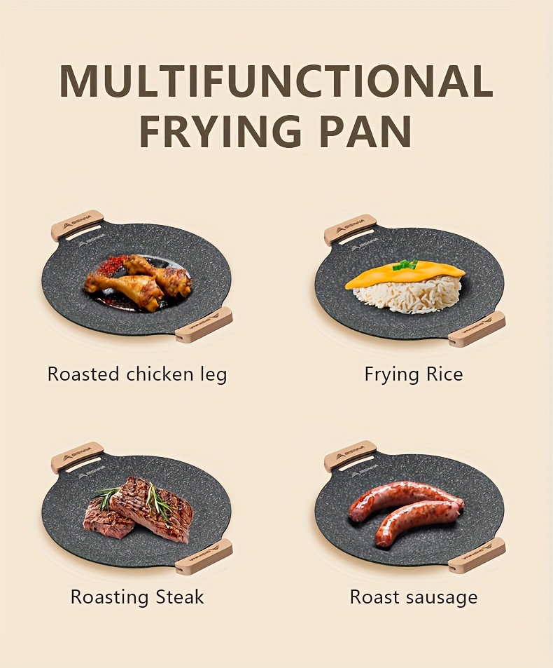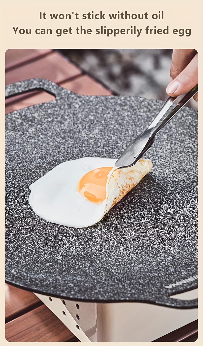 The BISINNA Non-Stick Aluminum Frying Pan is a durable and portable outdoor cooking pan designed for camping, picnics, hiking trips, and general outdoor food preparation. Made from high-quality aluminum alloy with a smooth non-stick surface, it offers fast heat conduction and easy cleanup after cooking fish, shrimp, vegetables, eggs, or stir-fry dishes.