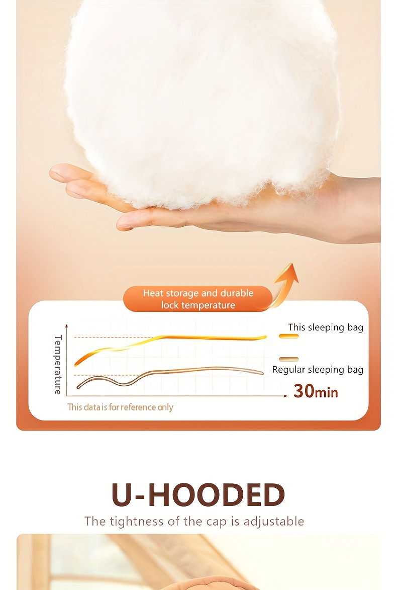 The zipper closure ensures easy entry and exit while offering adjustable ventilation depending on the weather. The attached hood (hat) provides added warmth around the head and neck, reducing heat loss in cold nighttime conditions. Made from durable polyester fiber, the outer shell resists wear, moisture, and rugged terrain, making it suitable for NZ campsites, trail shelters, and mountain conditions.