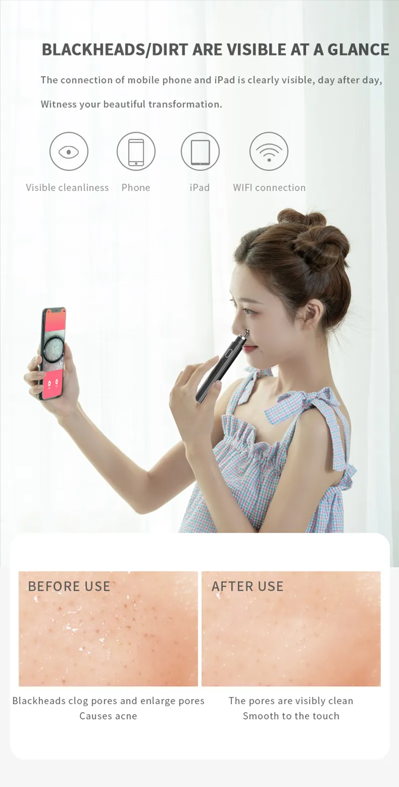 Engineered with intelligent technology and gentle yet effective suction, this device safely removes impurities from your nose, chin, and face without damaging your skin. The 30X camera connects seamlessly to your smartphone, giving you a live visual guide as you clean your pores, ensuring accurate and efficient results every time.