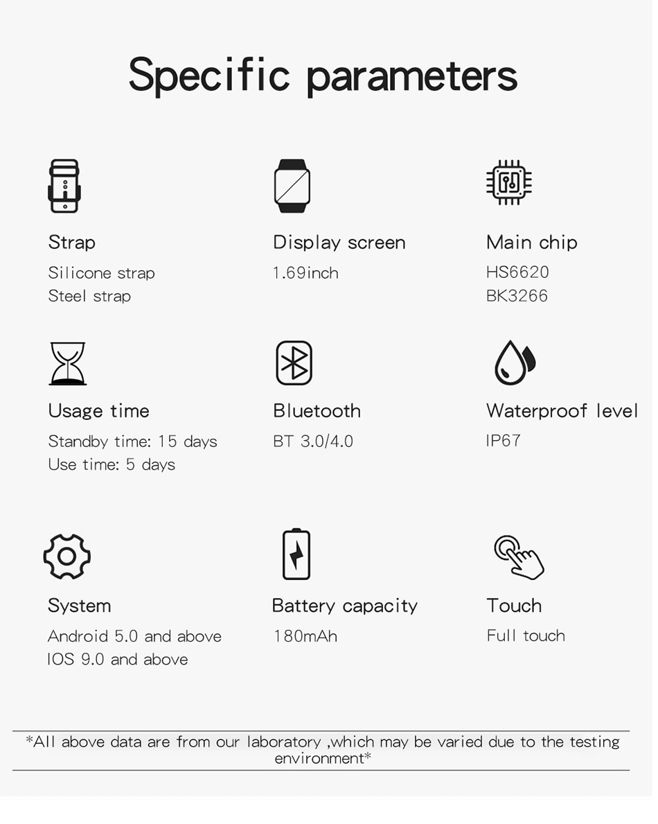 Function: waterproof, audio and video entertainment, step counting, heart rate monitoring, bluetooth call, smart reminder, remote control