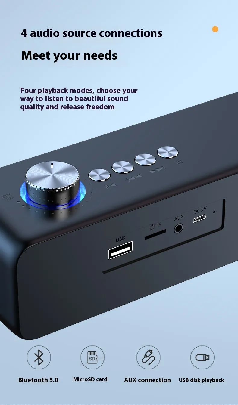 - AUX y Entradas USB: Conecte dispositivos sin Bluetooth a través del conector de audio de 3,5 mm o el puerto USB.