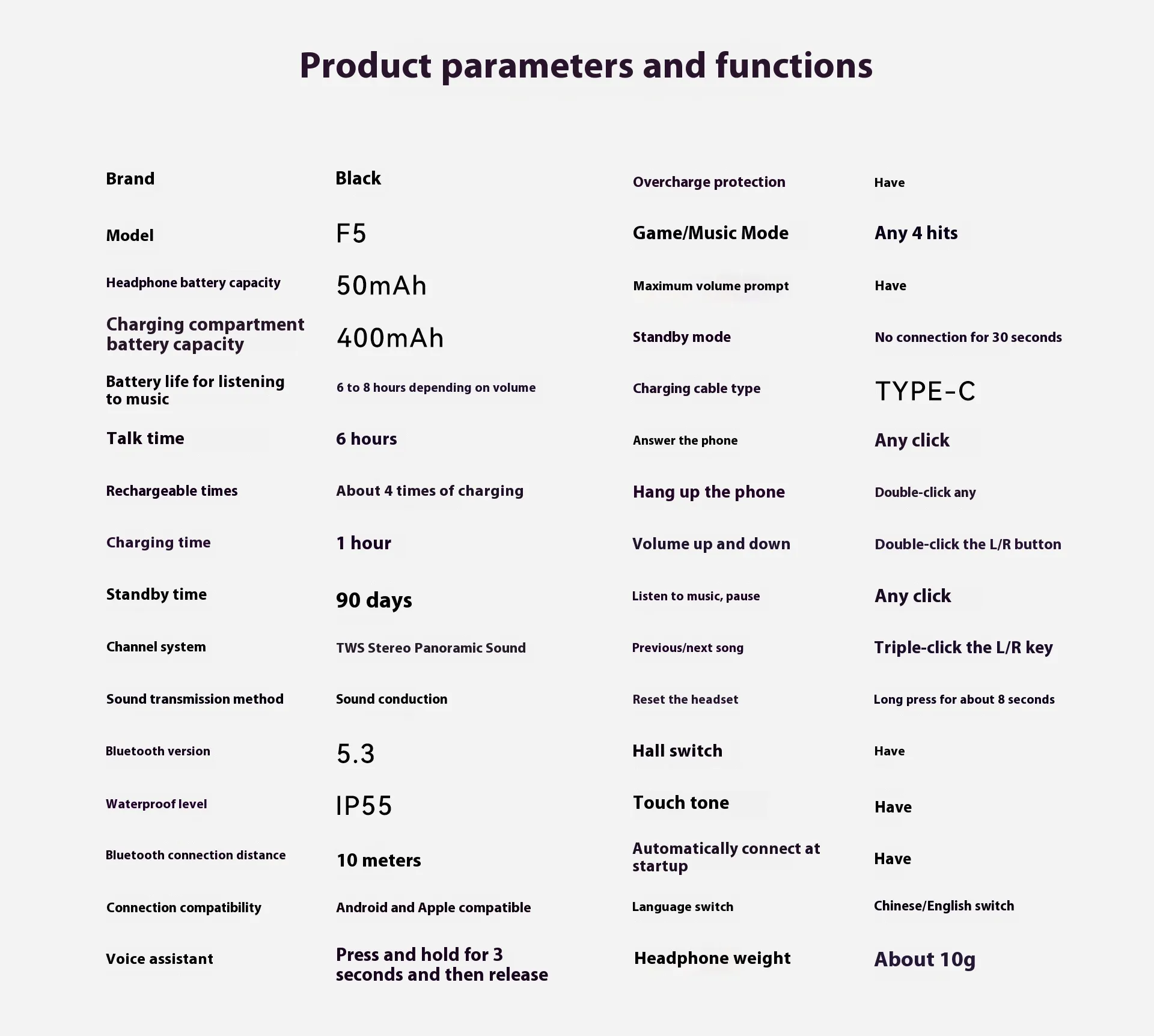 Function: waterproof, breathing light, ultra-long life battery, call function, voice control, support music