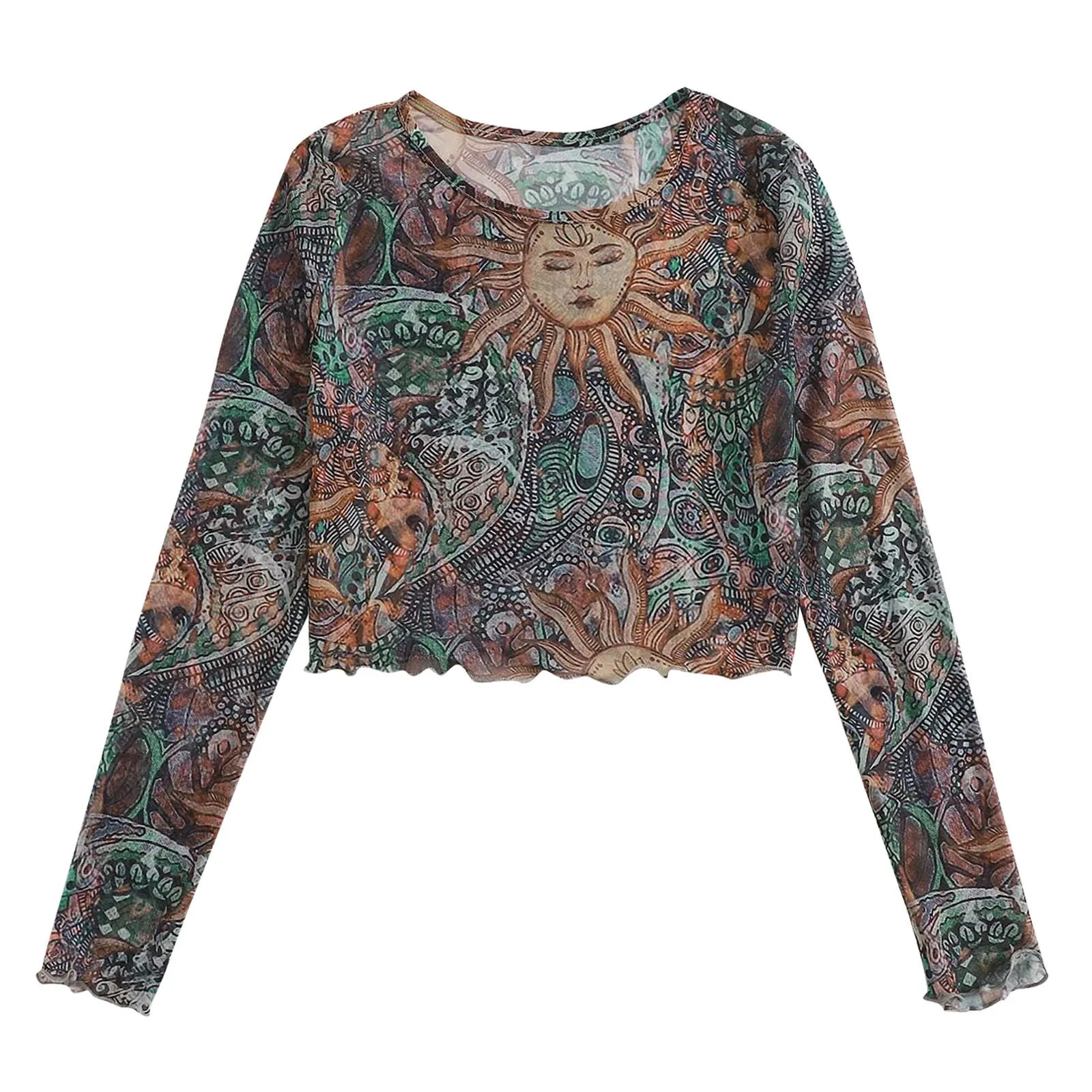 Blusa de mujer con cuello redondo, malla transparente y estampado de girasoles, mangas largas
