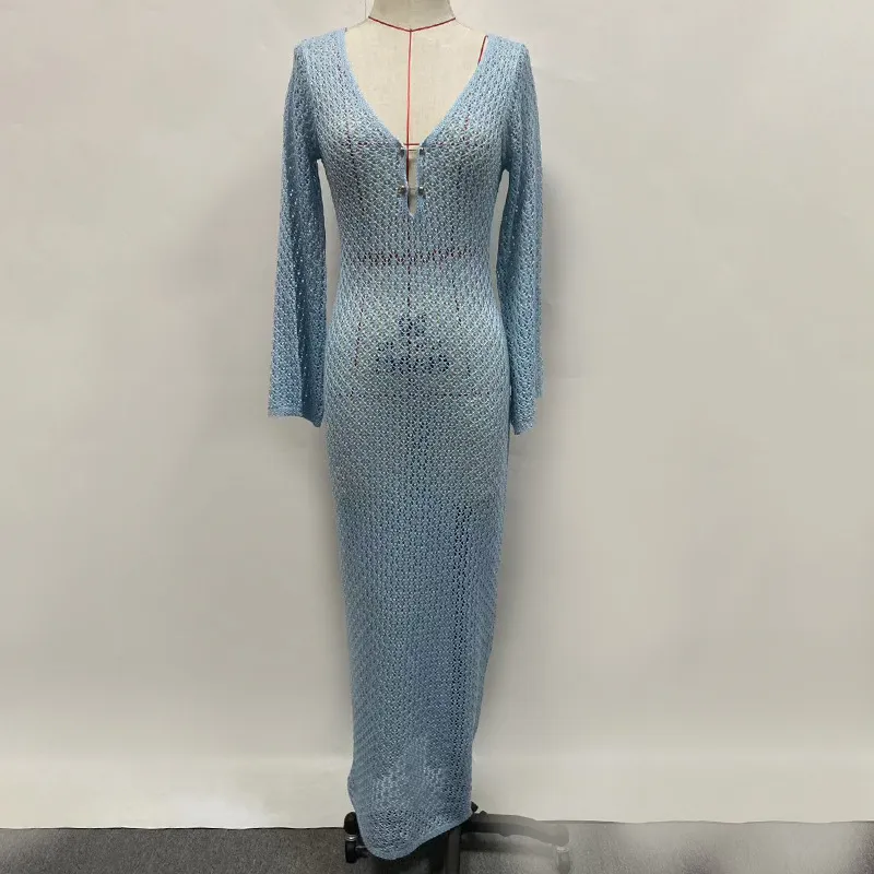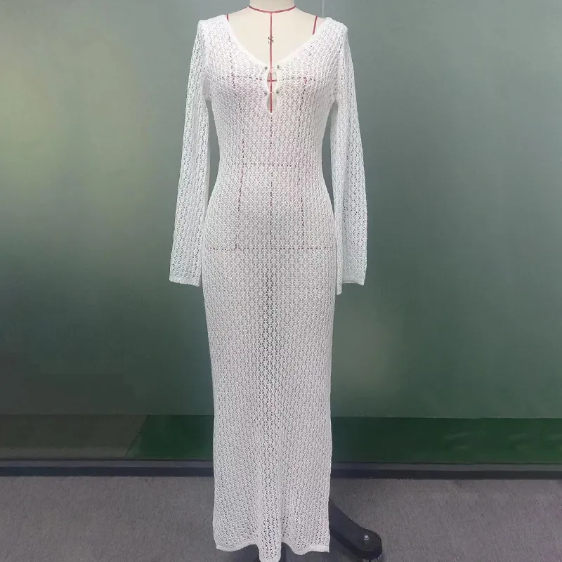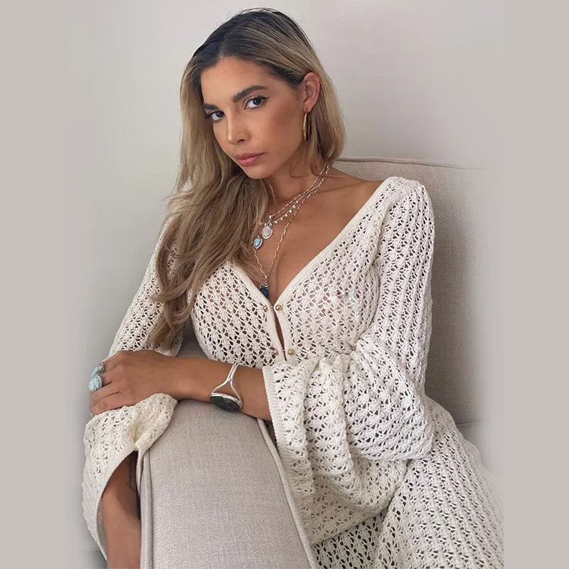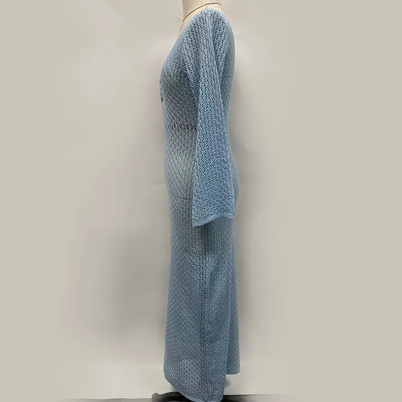 Blusa de traje de baño de playa ahuecada de punto de color sólido, falda de mujer a prueba de sol