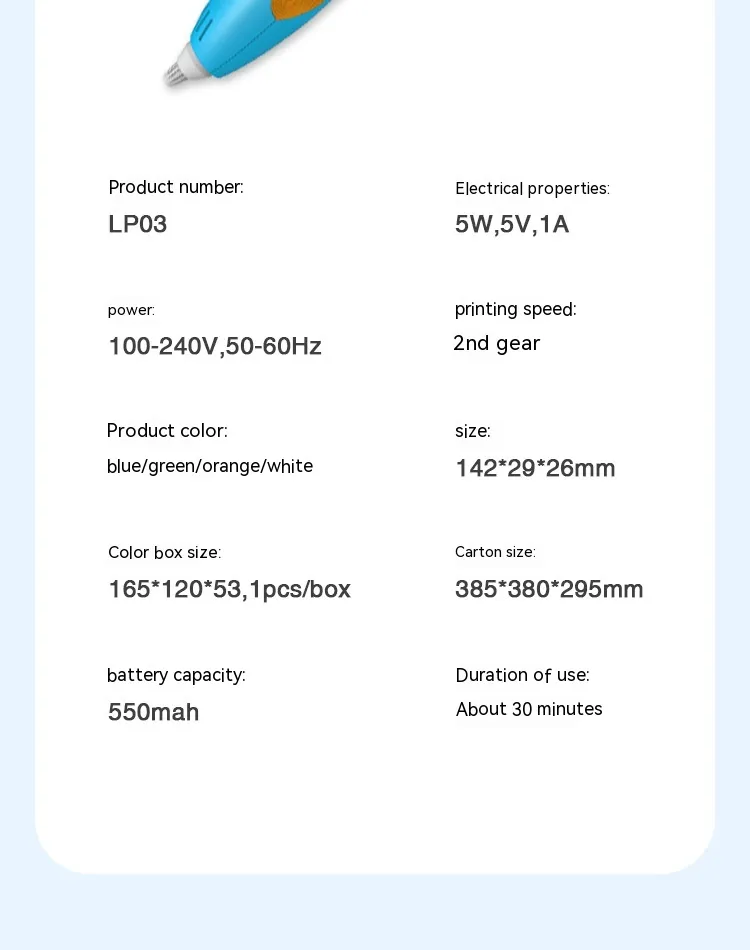 Su diseño ligero y portátil lo hace fácil de llevar contigo, para que puedas dibujar e imprimir dondequiera que te llegue la inspiración. El bolígrafo viene con un cable de carga USB, lo que garantiza que siempre esté listo para tu próximo proyecto.