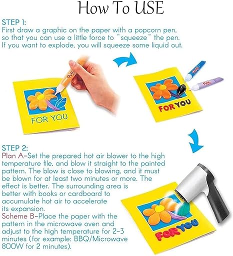 【Fácil de usar】-- Dibuje lo que quiera en un papel o cualquier superficie, aplique calor uniforme con un secador de pelo o microondas durante al menos 2 ¡En solo unos minutos tendrás increíbles proyectos de arte inflados!