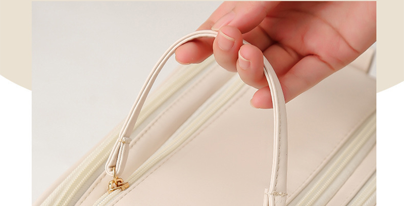 Bolsa de cosméticos de tres capas con doble cremallera y diseño en forma de U, moderna y de alta capacidad, de cuero sintético portátil, para productos de cuidado de la piel.