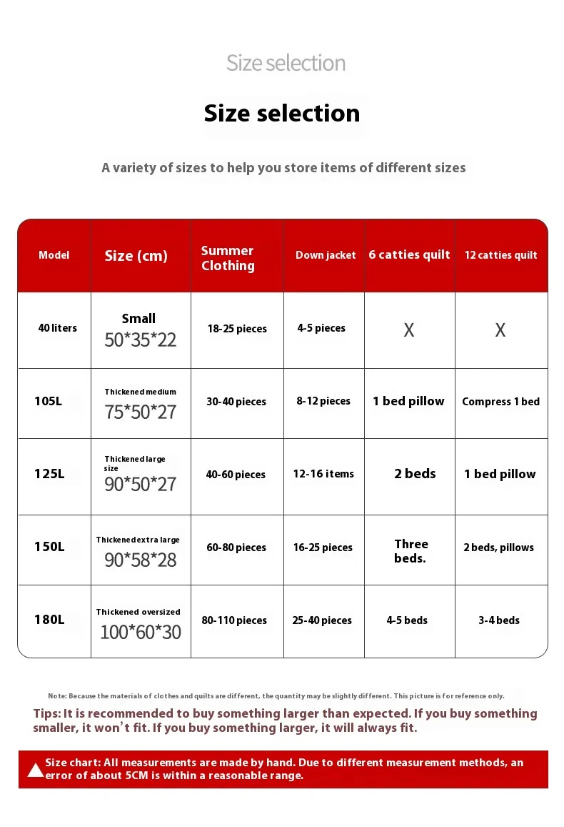 Especificaciones: 40 litros (50*35*22), 105 litros (75*50*27), 125 litros (90*50*27), 150 litros (90*58*28), 180 litros (100*60*30)