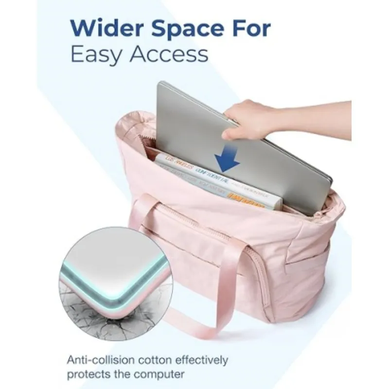 La bolsa de gimnasio de viaje para mujer ofrece un amplio espacio de almacenamiento, lo que la hace perfecta para llevar tu ropa deportiva, zapatos, botellas de agua y otros artículos esenciales. Con múltiples compartimentos, puedes organizar fácilmente tus artículos y mantener tu equipo de gimnasio separado de tus pertenencias personales. El compartimento principal es lo suficientemente amplio para artículos grandes, mientras que los bolsillos laterales ofrecen espacio para accesorios más pequeños como llaves, teléfono o billetera.
