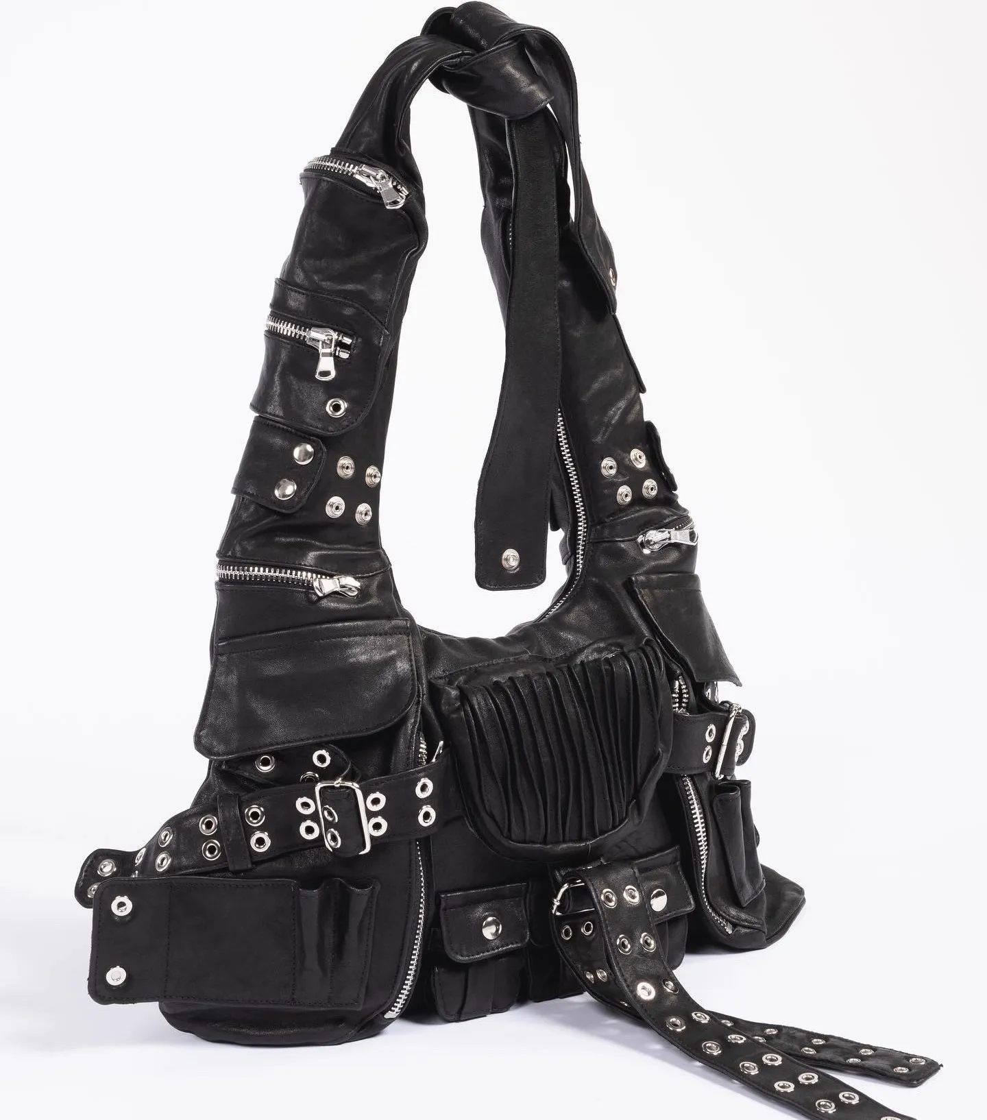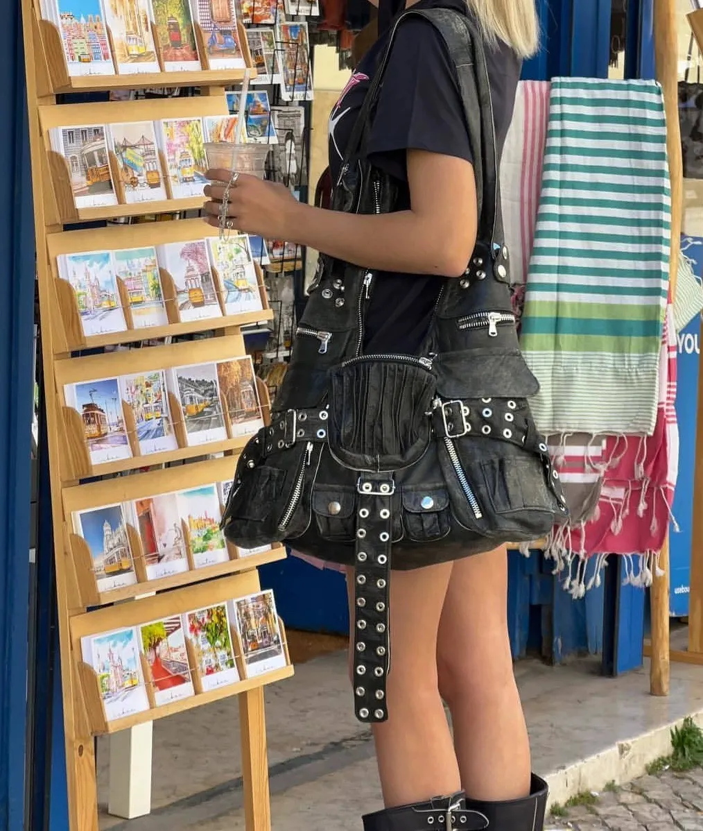 La combinación de la correa ancha anudada y los tonos oscuros crea un accesorio atrevido y elegante que realza su apariencia general.