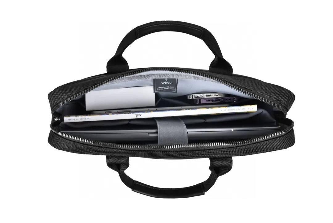 Bolso de mano con diseño de múltiples bolsillos para artículos clasificados y colocados por separado en una capa para computadora.