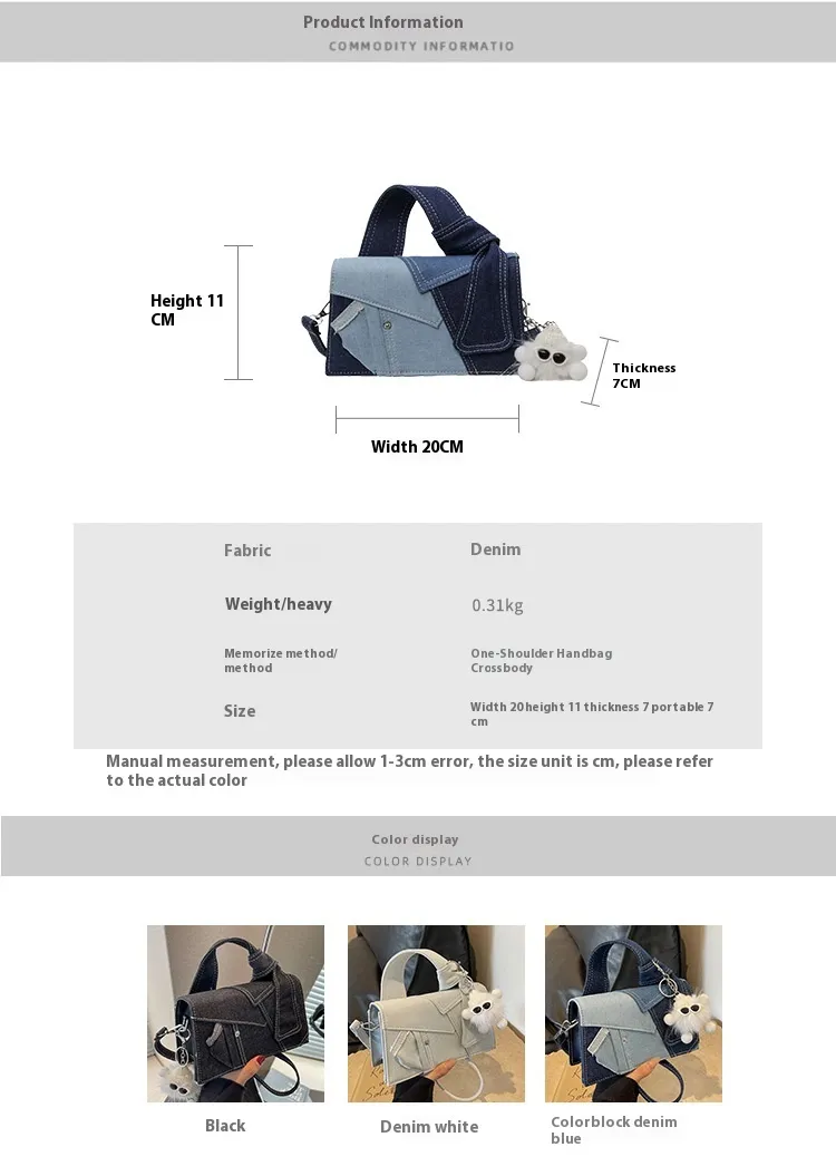 Hecho de tela de mezclilla de alta calidad, este bolso pequeño está diseñado para soportar el desgaste diario. La mezclilla es duradera y resistente. Resistente a la decoloración y fácil de limpiar, lo que garantiza que su bolso se mantenga fresco durante más tiempo. Los resistentes detalles de cuero y las costuras reforzadas proporcionan una mayor durabilidad, por lo que puede confiar en este bolso para llevar sus objetos esenciales sin preocuparse por el desgaste.