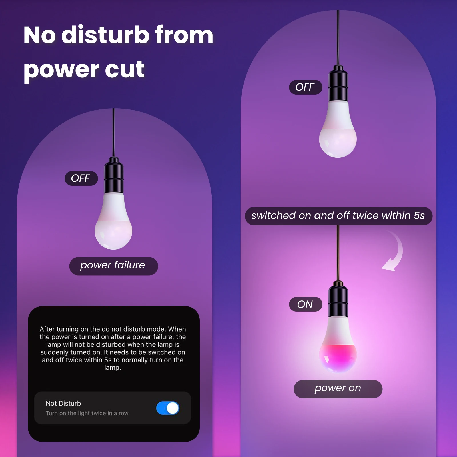 Después de un corte de luz, la bombilla permanece apagada, lo que garantiza que su trabajo y descanso no se interrumpan.