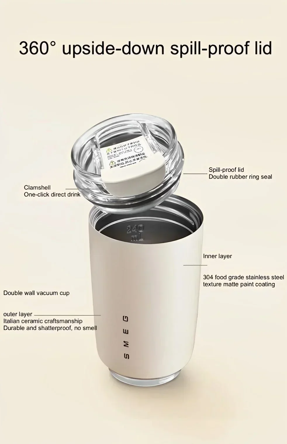 Esta botella térmica está diseñada para ser versátil, adecuada para una variedad de bebidas. Úsala como botella de agua para mantenerte hidratado mientras viajas, como termo para mantener caliente tu café de la mañana o incluso como taza de viaje para té, batidos o bebidas frías. Su boca ancha facilita el llenado, el vertido y la limpieza, mientras que la tapa a prueba de fugas evita derrames, proporcionando una experiencia sin complicaciones dondequiera que estés. Ya sea que estés viajando, haciendo senderismo o trabajando en una cafetería, esta botella SMEG se adapta a tu estilo de vida, ofreciendo una solución elegante y funcional para la hidratación diaria.