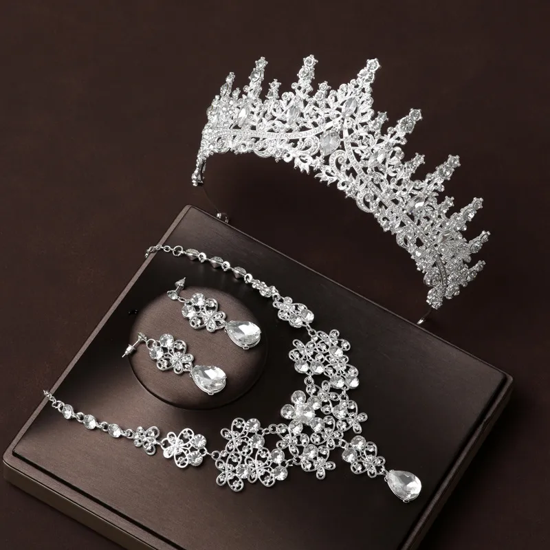 The Bridal Headdress Crown Vintage Necklace Three-piece Earrings Set Pack works by offering a coordinated, luxurious look for your wedding day. The crown sits delicately on your head, adding a regal touch, while the necklace gracefully highlights your neckline and the earrings add a sophisticated sparkle to your face. The pieces work together to create a stunning bridal ensemble, adding both beauty and elegance to your look.