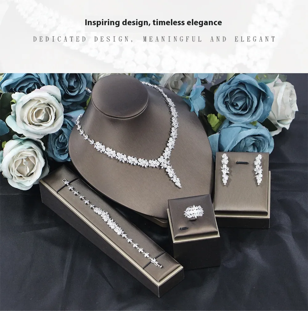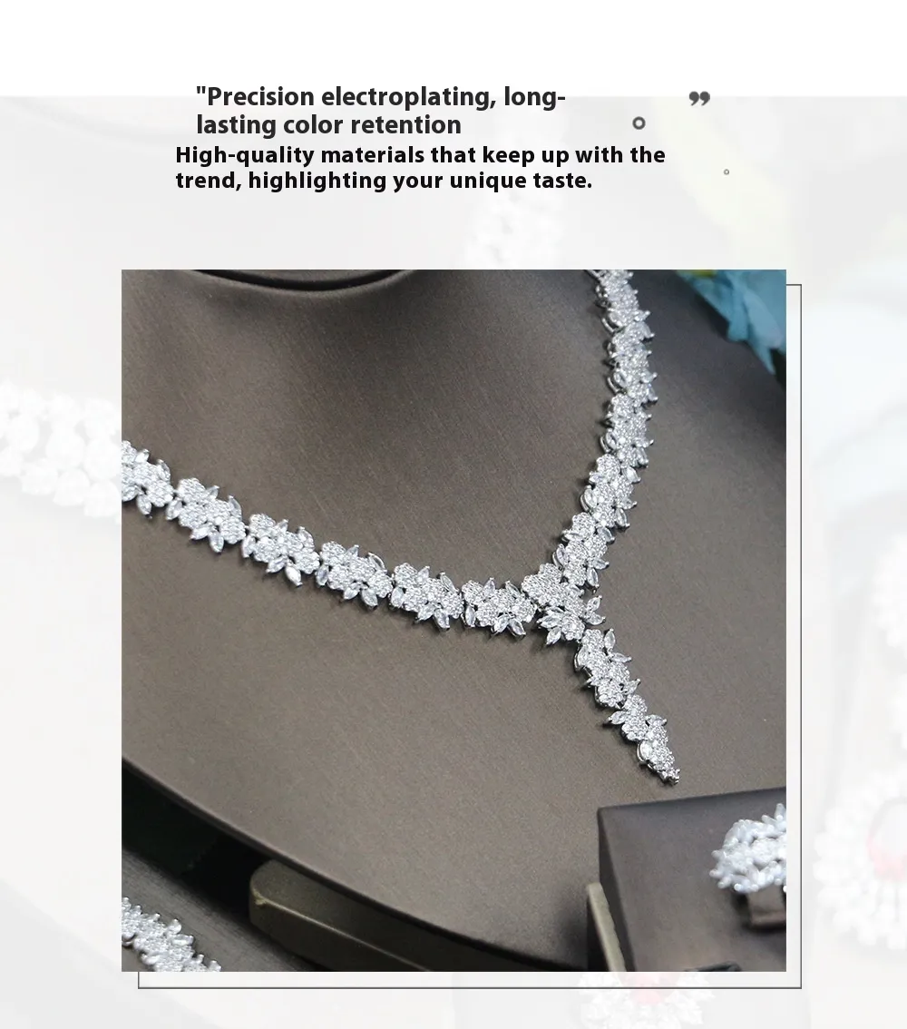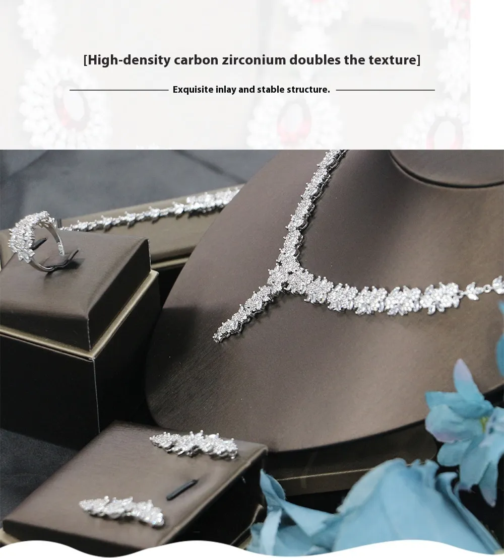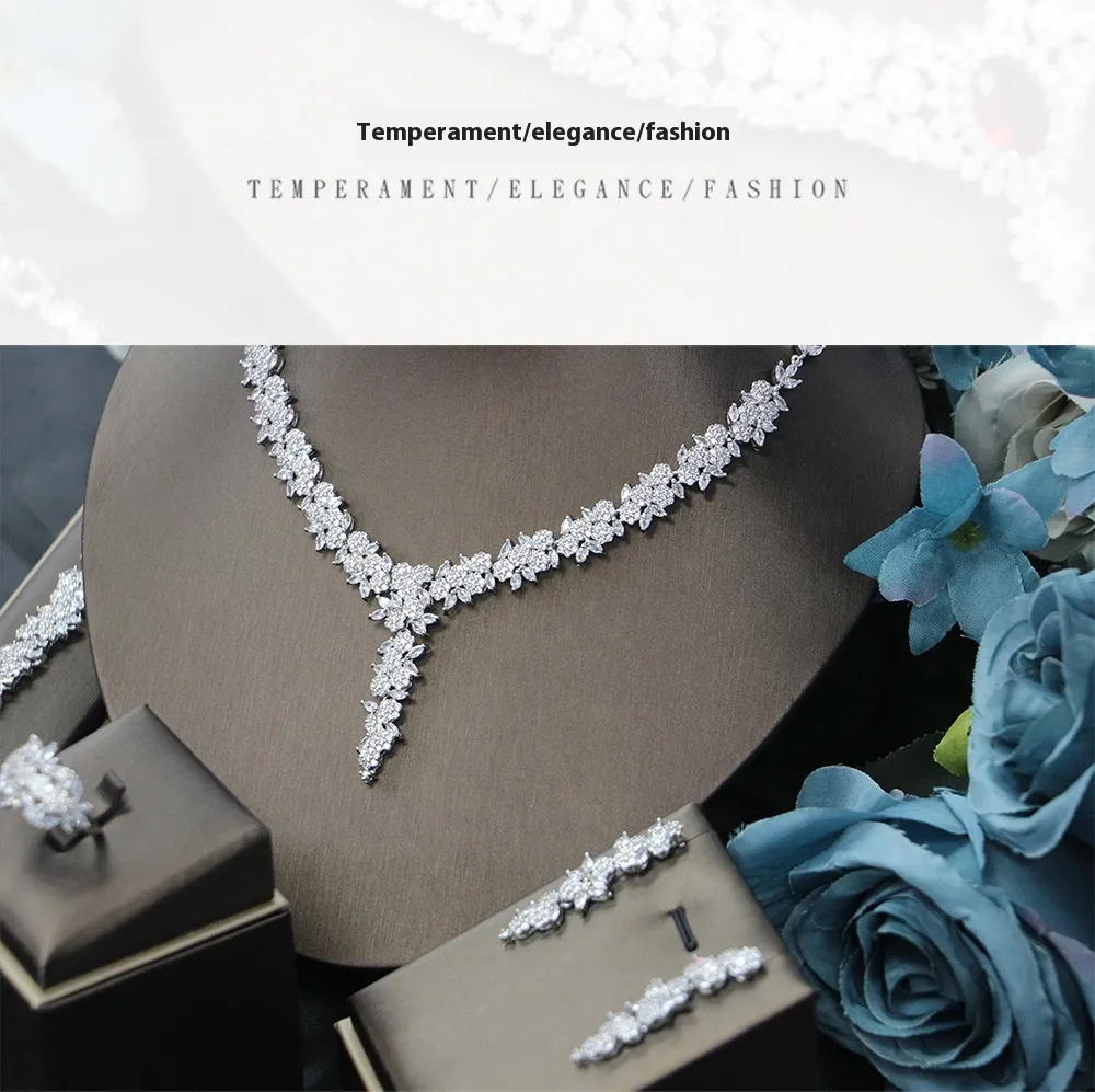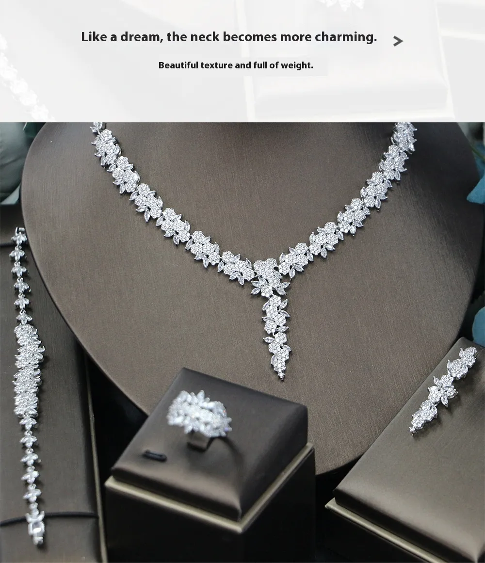 Bridal Wedding Dinner Jewelry Suit Fashion Rose Zircon Necklace Earrings Four-piece Set