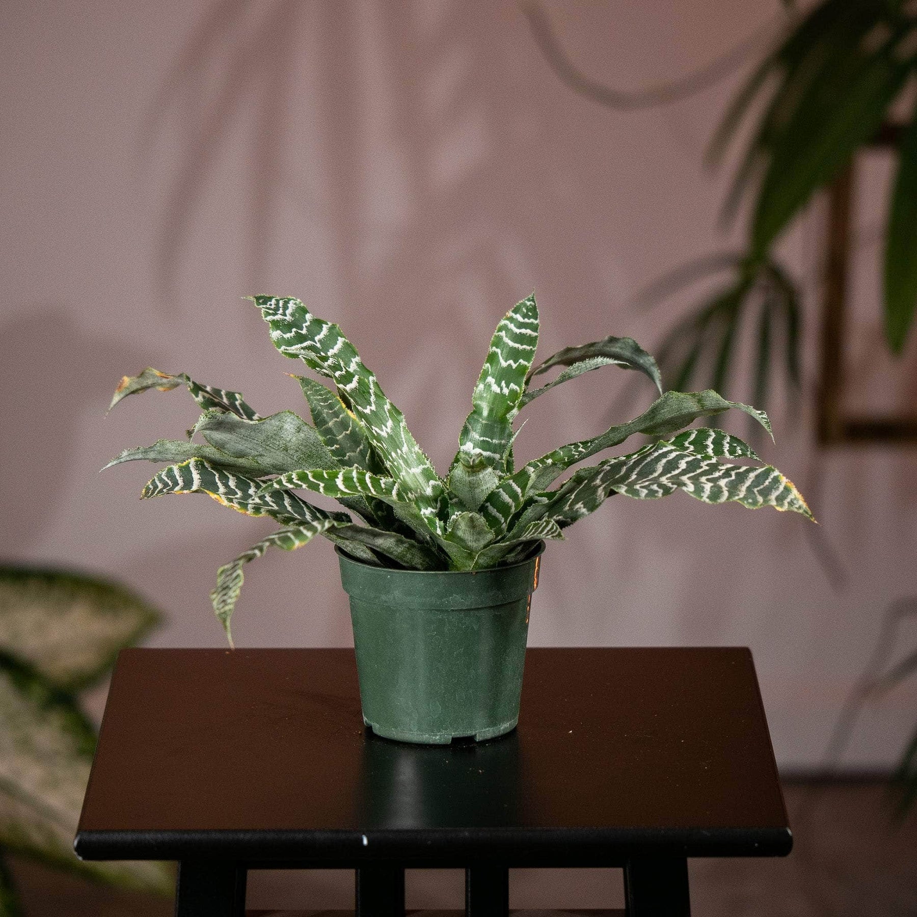 Esta bromelia compacta prospera con un cuidado mínimo y es perfecta para agregar un toque de color a espacios pequeños como escritorios, estantes o alféizares de ventanas. Su forma única y baja la convierte en una opción ideal para terrarios o como planta decorativa en arreglos mixtos.