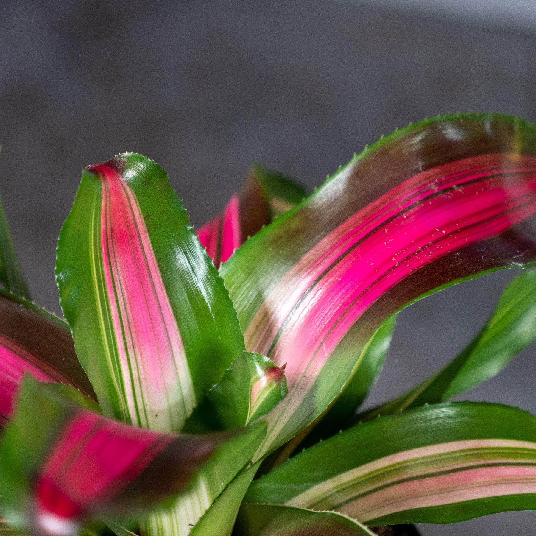 Neoregelia 'Wolfgang' features a rosette of broad, arching leaves that display an extraordinary blend of colors. The leaves are a lush green with vivid, bright pink and red central stripes that radiate outward, creating a dazzling visual contrast. The edges of the leaves are often tinged with a soft, reddish hue, adding to the plant's overall allure. This Bromeliad's compact and symmetrical growth habit makes it an ideal centerpiece or accent plant in any setting.