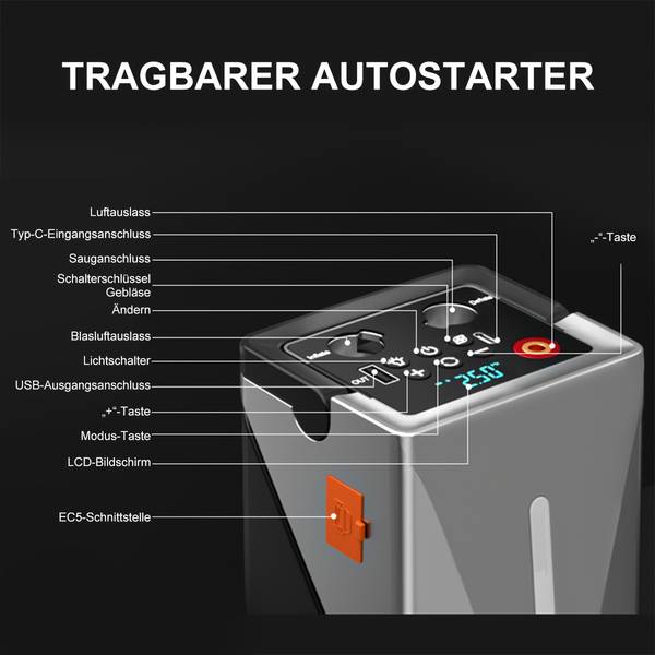 Built with a rechargeable lithium-polymer battery and operating safely under ≤36V, the jump starter delivers instant power to dead batteries, making it ideal for cars, SUVs, 4WDs, vans, motorcycles, boats, and even large diesel vehicles up to 10.0L. Its 12V output power provides the strength needed for reliable engine starts even in colder weather or after long periods of battery inactivity.