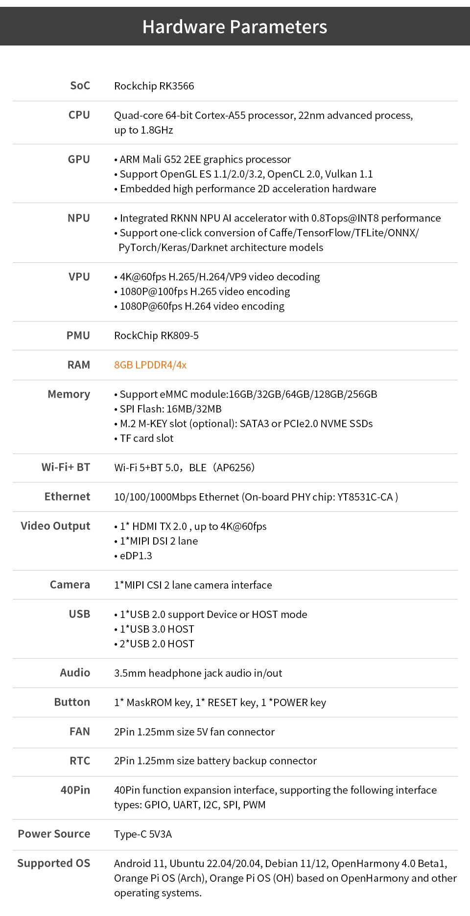 Supported: Android 11, Ubuntu 22.04, Ubuntu 20.04, Debian 11, Debian 12, OpenHarmony 4.0 Beta1, Orange Pi OS (Arch), Orange Pi OS (OH) based on OpenHarmony and other operating systems.