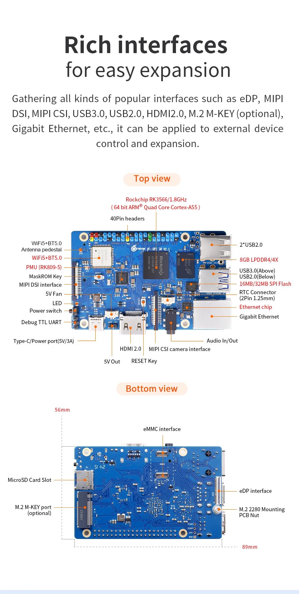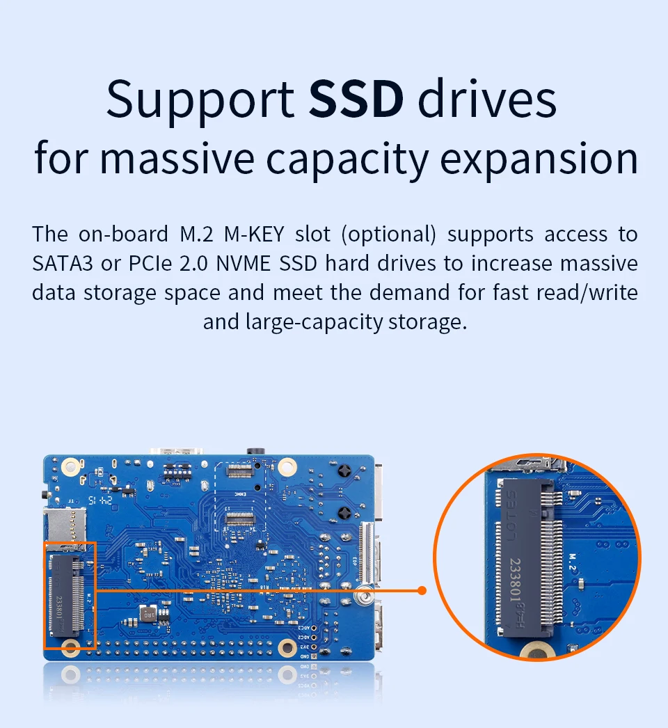 Memory: Support eMMC module:16GB/32GB/64GB/128GB/256GB;SPI Flash: 16MB/32MB;M.2 M-KEY slot (optional): SATA3 or PCIe2.0 NVME SSDs;Micro SD slot