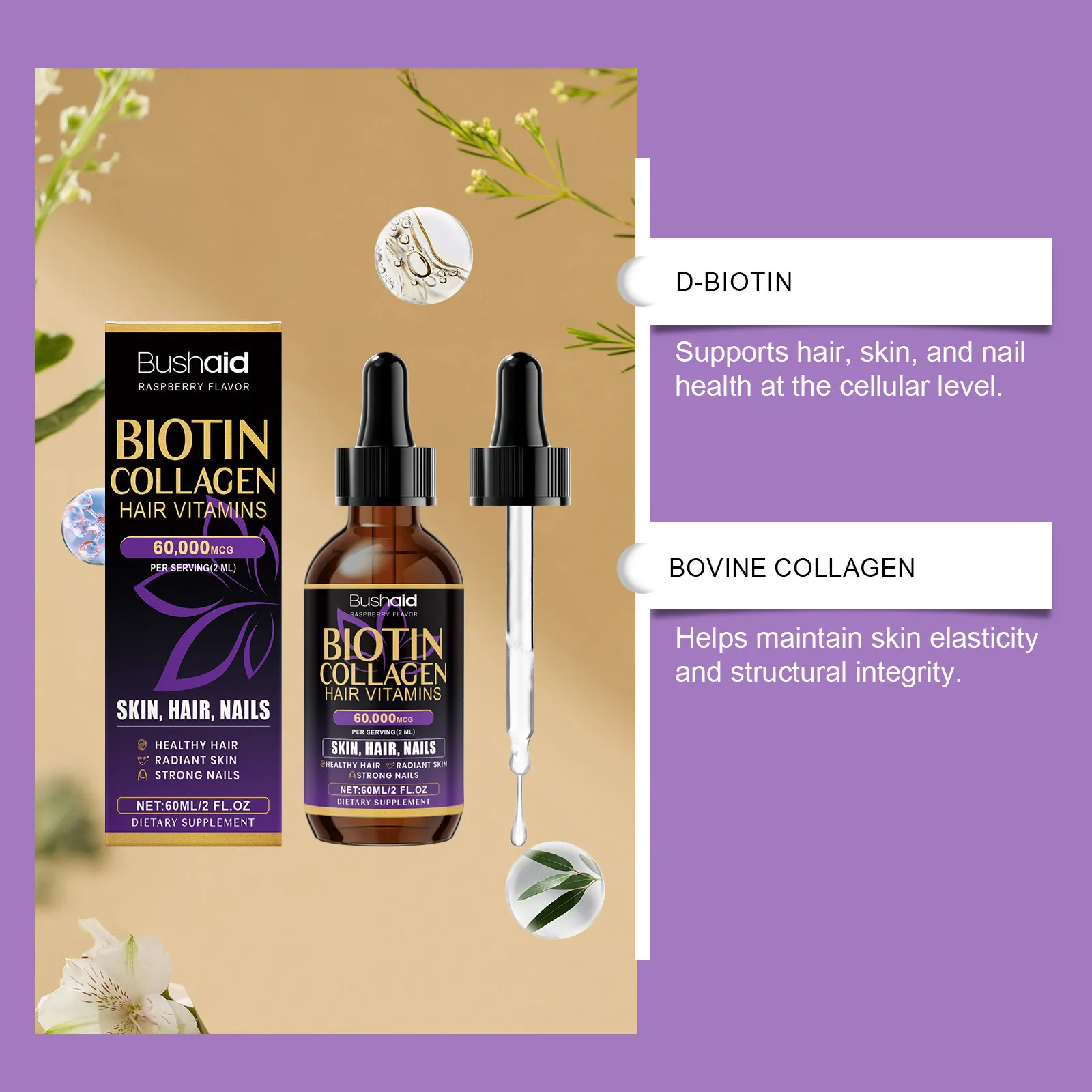Bushaid Biotin Collagen Hair Vitamins are a high-strength liquid supplement supporting healthy hair, radiant skin, and strong nails with 60,000 mcg biotin per serving.