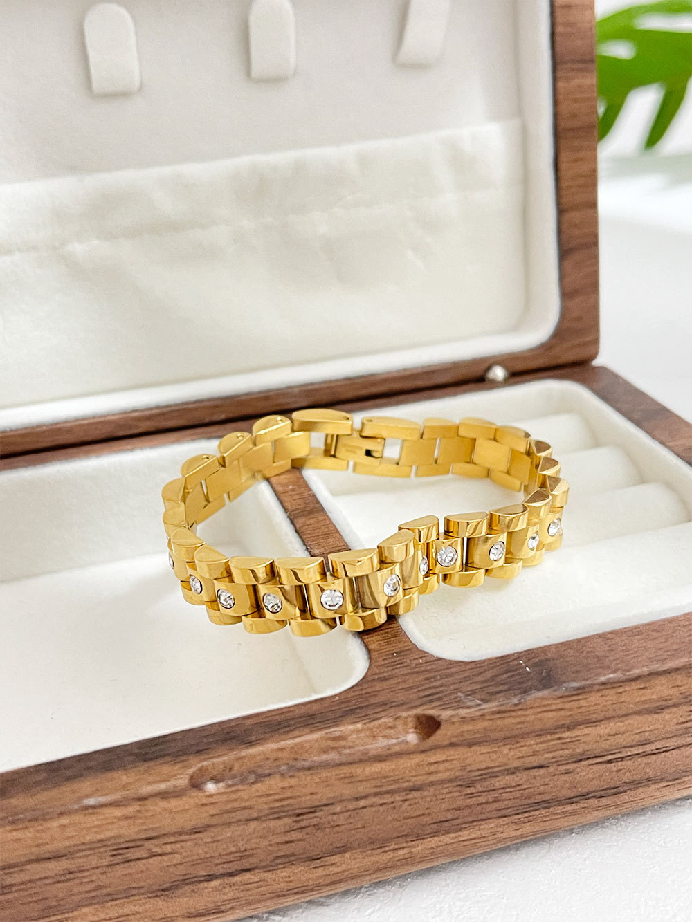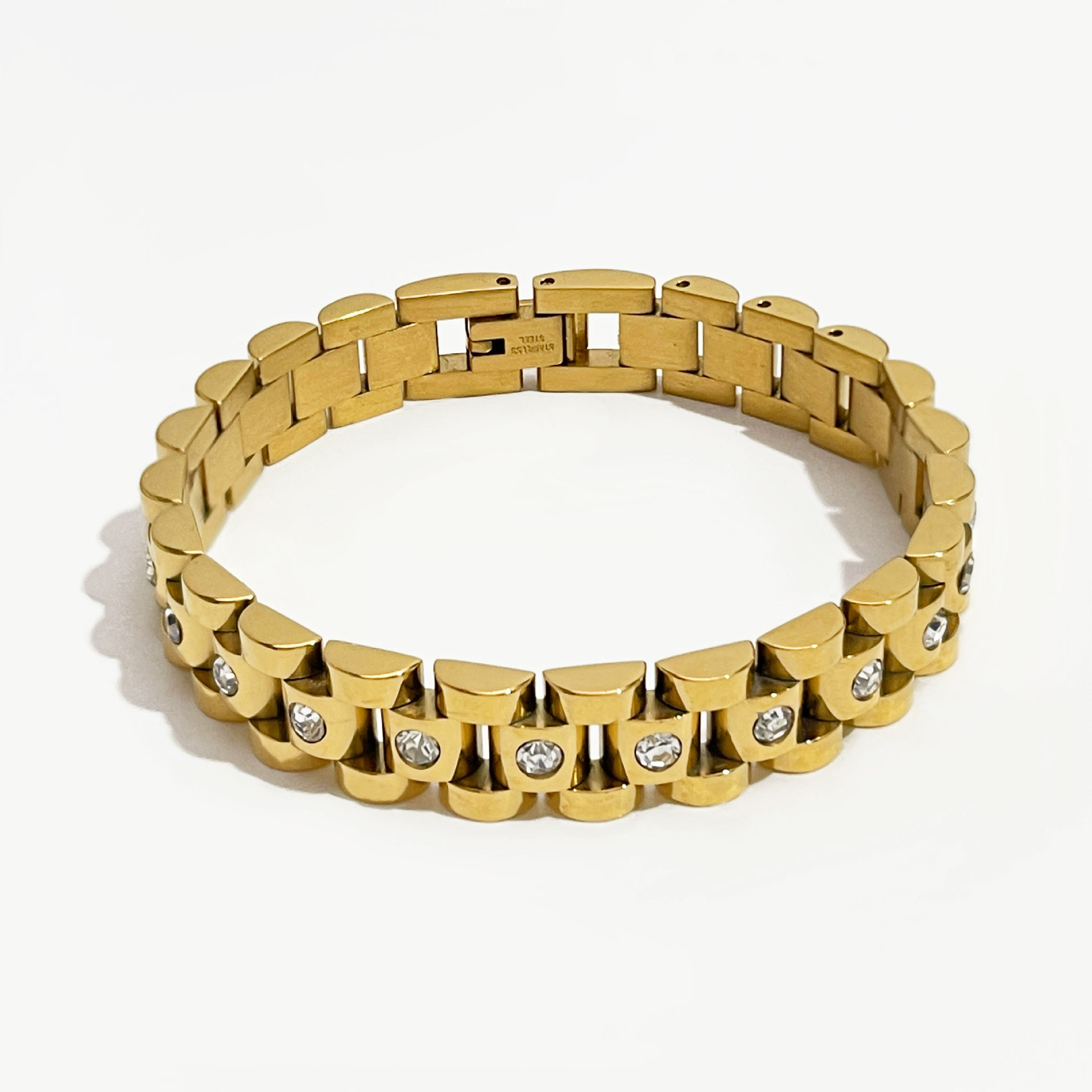 Realza tu estilo con la Cadena de Reloj de Acero y Titanio con Diamantes Blancos, una elegante pulsera con un acabado resistente a la decoloración en oro de 18 quilates. Este lujoso accesorio combina la durabilidad del acero de titanio con el brillo de los diamantes blancos, convirtiéndolo en una adición atemporal a cualquier colección de joyas.