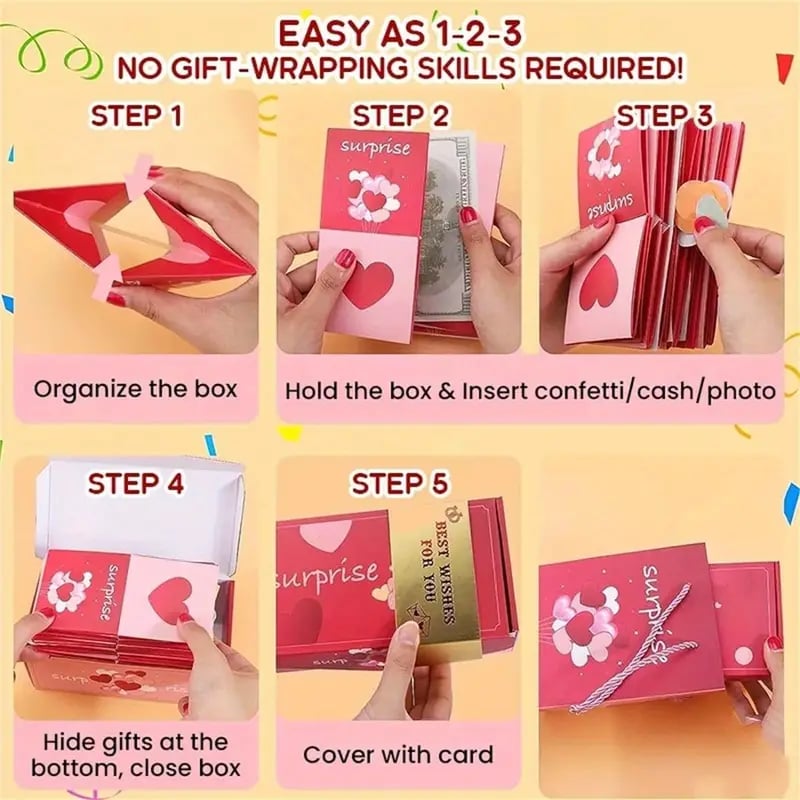 🎁Fácil de usar: Puede insertar tarjetas de felicitación con foto de confeti de efectivo en el espacio entre las caja y la caja, y coloca anillos, collares, pulseras, relojes, perfumes u otros pequeños gadgets en el fondo de la caja sorpresa.