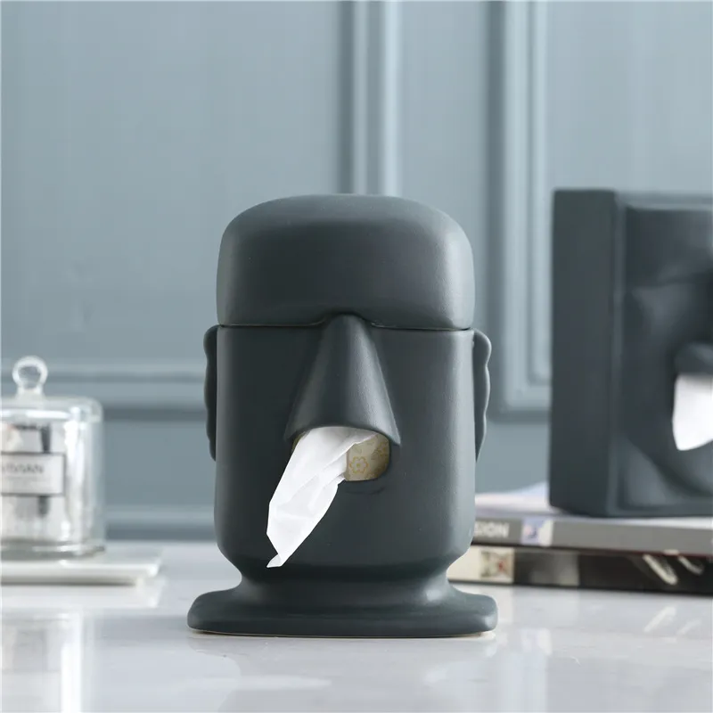 Ordene hoy mismo su porta pañuelos de cerámica con cajón en forma de estatua Moai y añada una combinación única de estilo y funcionalidad a su decoración. Perfecto para quienes aman el arte moderno y los accesorios únicos para el hogar.