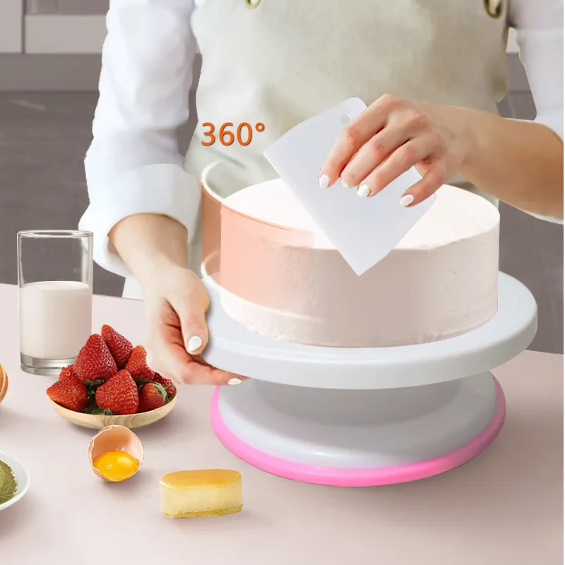 The Cake Turntable is an essential baking tool designed to simplify the process of decorating cakes. It features a rotating platform that allows you to spin the cake smoothly while applying icing, frosting, or decorative elements. This continuous rotation helps create even layers and clean finishes without needing to reposition the cake manually.