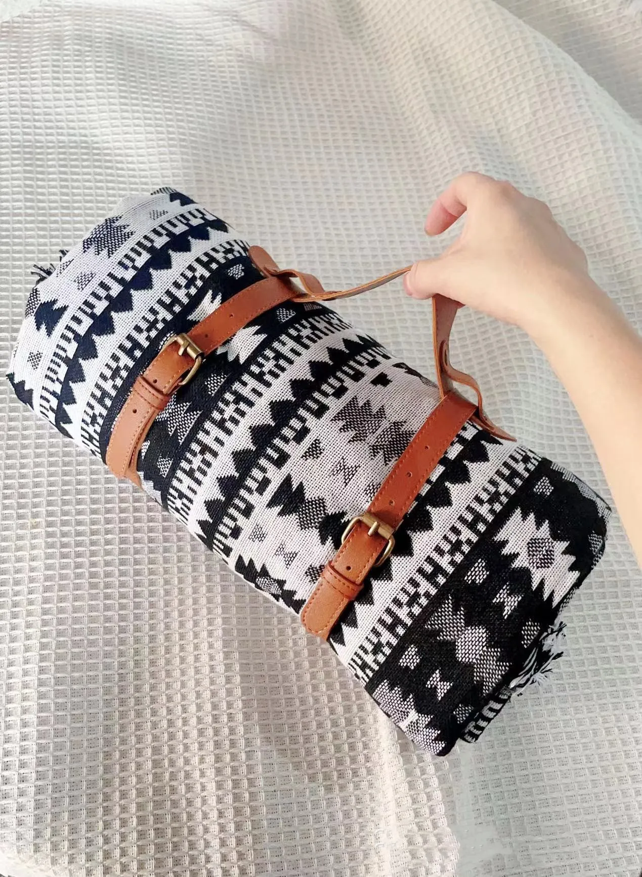 The blanket folds easily into a compact, travel-friendly size, often equipped with carrying straps or handles, making it convenient to transport on hiking trails, road trips, or beach days.