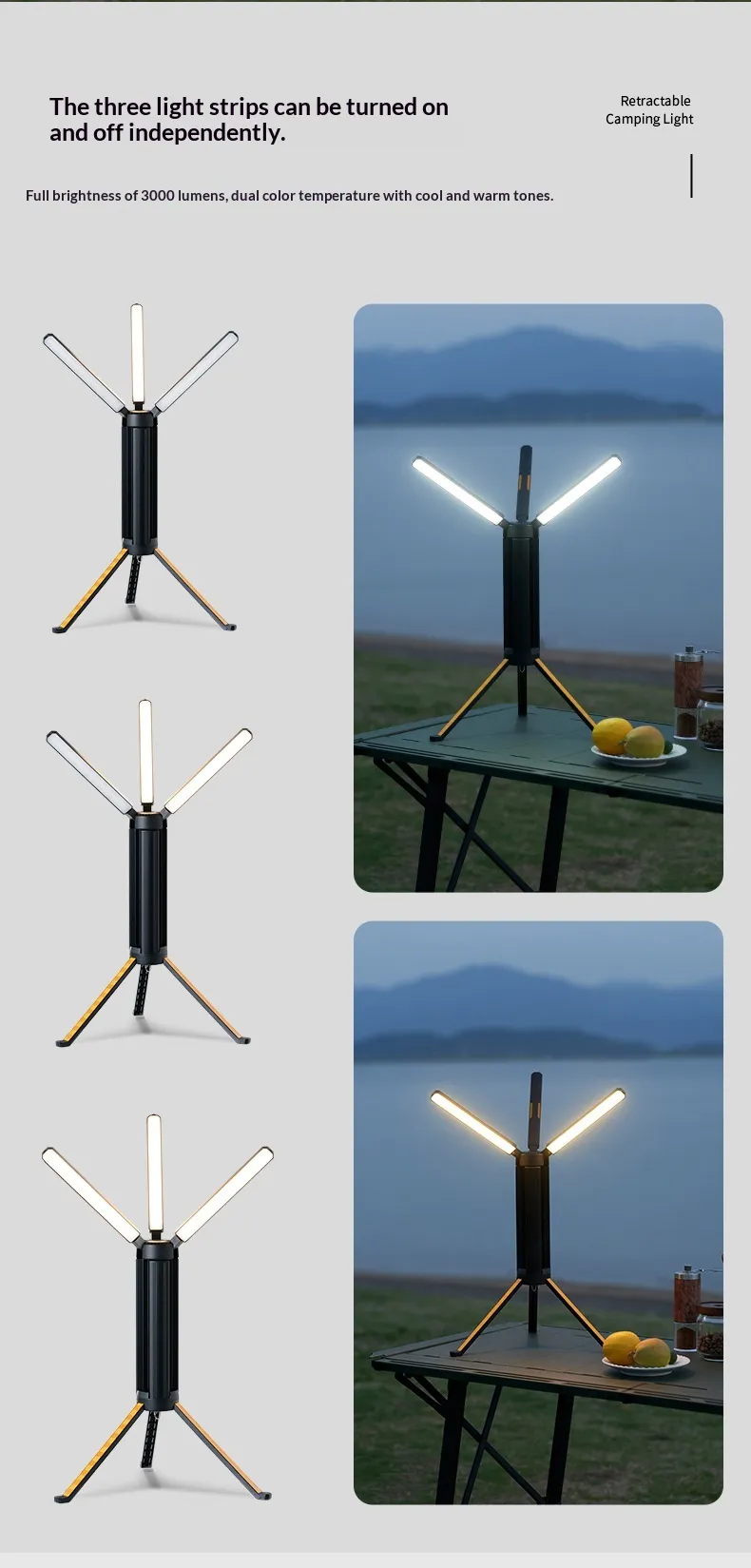 With high brightness output of up to 3000 lumens, the light provides clear visibility in dark conditions, making it suitable for camping, night activities, and outdoor setups. The dual colour temperature feature allows switching between cool and warm tones, giving users flexibility to create the desired lighting atmosphere.