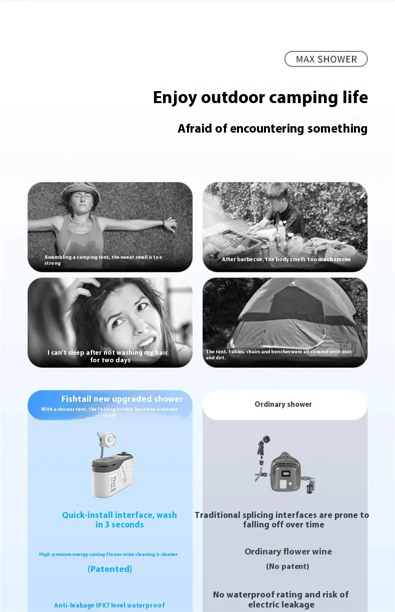 - Efficient Water Pump: Delivers a steady stream of water for an effective shower, even in remote areas.