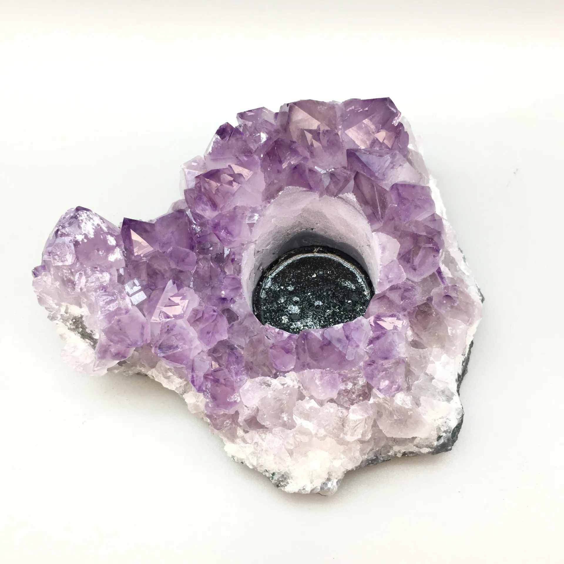La decoración de candelabro con forma de cavidad de amatista natural está diseñada para sostener una vela de tamaño estándar. Tiene capacidad para la mayoría de las velas pequeñas de pilar, velas de té o velas cónicas.