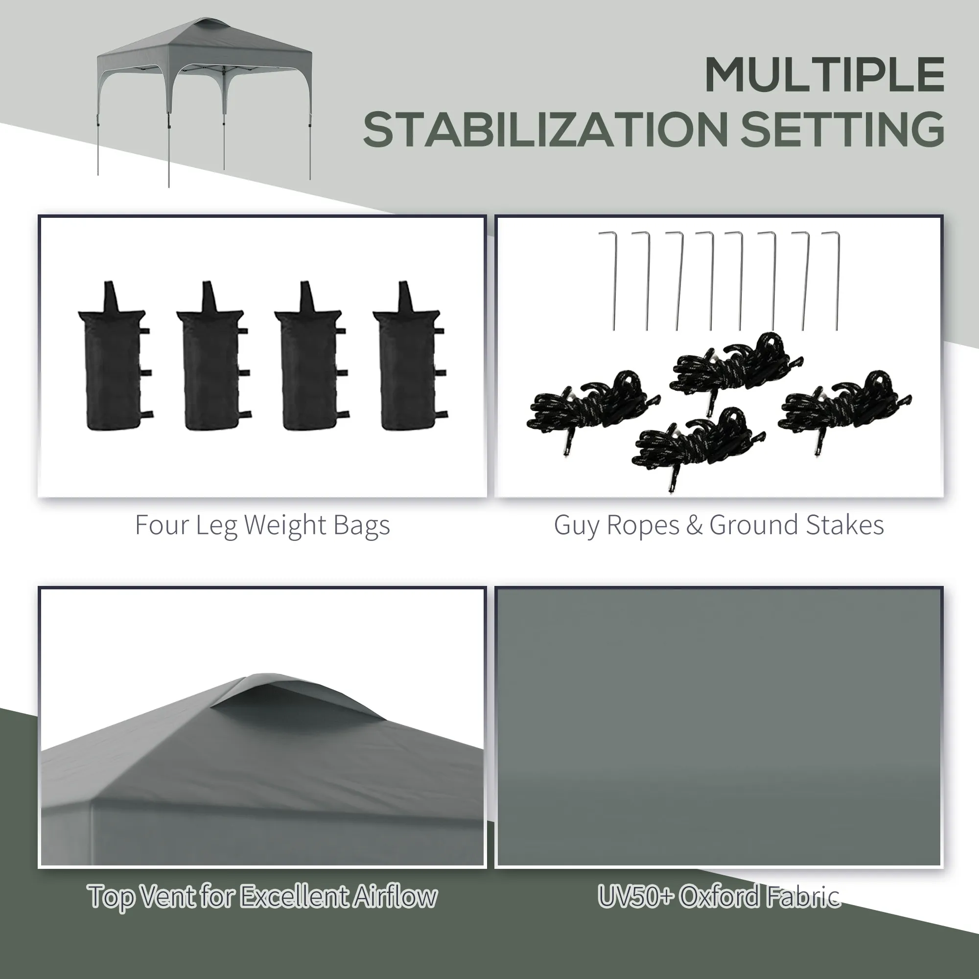 Our Outsunny folding party tent is terrific for outdoor gatherings and camping trips. It's simple to put up: the gazebo goes up in minutes. The outdoor tent canopy includes a powder-coated steel frame, and UV50+ Oxford fabric protects you from direct sunlight. It comes with four leg weight bags and adds up to 44 lbs. in total when filled. After folding, store the tent in the handy wheeled bag and transport it almost effortlessly. Features: - Pop up design allows users to set up and takedown in minutes - Top vents improve air circulation and wind resistance - Freely adjustable legs to change the height easily - Equipped with a handy wheeled bag for easy moving and carrying - Comes with four leg weight bags and adds up to 44 lbs. in total when filled - Guy ropes and stakes for added stability - Assembly required Specification: - Color: Dark Grey - Materials: Steel, Oxford - Overall Dimension: 120"L x 120"W x 114.25"H - Eaves Height: 86.5'' - Beam Height: 76.75'' - Folding Size: 9.75"L x 9.75"W x 50.5"H - Item Label: 84C-262V01 - Note: For the longer use of the product, we do not recommend using the gazebo in bad elements Package Includes: - 1 x Foldable Gazebo - 4 x Sand Bag - 4 x Guy Rope - 8 x Ground Stake - 1 x Carry Bag - 1 x Manual Our Outsunny folding party tent is terrific for outdoor gatherings and camping trips. in total when filled - Guy ropes and stakes for added stability - Assembly required Specification: - Color: White - Materials: Steel, Oxford - Overall Dimension: 120"L x 120"W x 114.25"H - Eaves Height: 86.5'' - Beam Height: 76.75'' - Folding Size: 9.75"L x 9.75"W x 50.5"H - Item Label: 84C-262V01WT - Note: For the longer use of the product, we do not recommend using the gazebo in bad elements Package Includes: - 1 x Foldable Gazebo - 4 x Sand Bag - 4 x Guy Rope - 8 x Ground Stake - 1 x Carry Bag - 1 x Manual Our Outsunny folding party tent is terrific for outdoor gatherings and camping trips. in total when filled - Guy ropes and stakes for added stability - Assembly required Specification: - Color: Blue - Materials: Steel, Oxford - Overall Dimension: 120"L x 120"W x 114.25"H - Eaves Height: 86.5'' - Beam Height: 76.75'' - Folding Size: 9.75"L x 9.75"W x 50.5"H - Item Label: 84C-262V01BU - Note: For the longer use of the product, we do not recommend using the gazebo in bad elements Package Includes: - 1 x Foldable Gazebo - 4 x Sand Bag - 4 x Guy Rope - 8 x Ground Stake - 1 x Carry Bag - 1 x Manual.