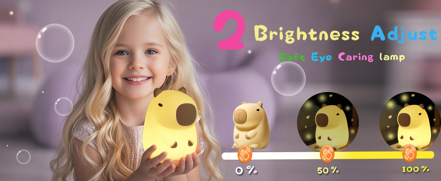 - Dimmable and BPA Free:Cute Capybara Night Light for Kids,Choose food grade silicone material, BPA free Soft and pinchable,that won't heat up while in use.Safe material and design suitable for everyone including babies,capybara lamp has two brightness modes. Soft lighting, eye friendly,Turn on the switch and simply tap the capybara light to switch brightness,Whether you prefer a soft glow or a brighter light, this lamp has got you covered.