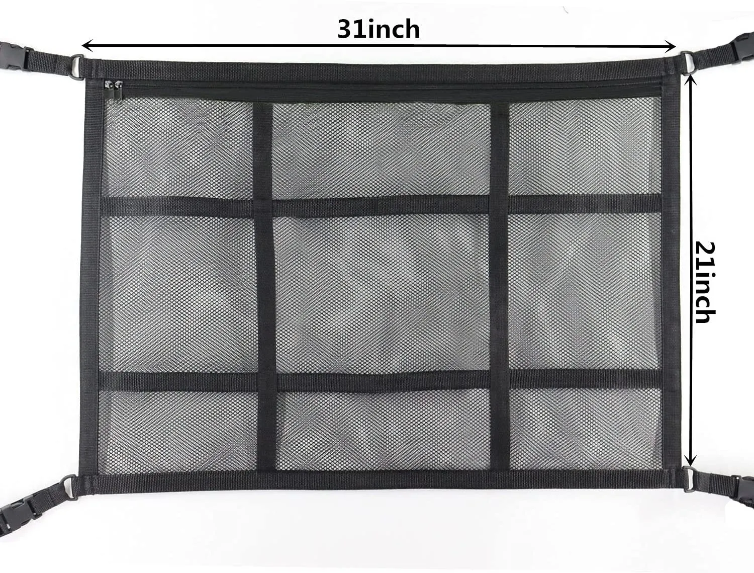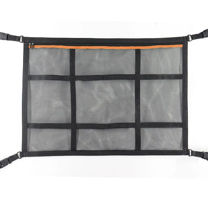 Made from ultra-strong polyester netting with reinforced stitching and alloy cam buckle straps, it mounts to the interior grab handles or door seals for a secure, rattle-free fit. The central zippered pocket holds larger items like jackets or blankets, while two side pockets keep smaller essentials organized.