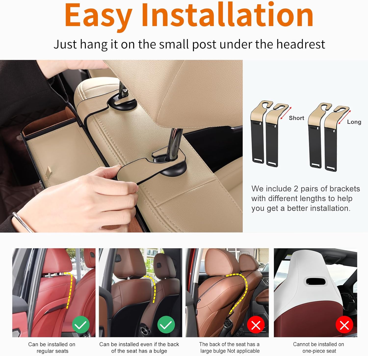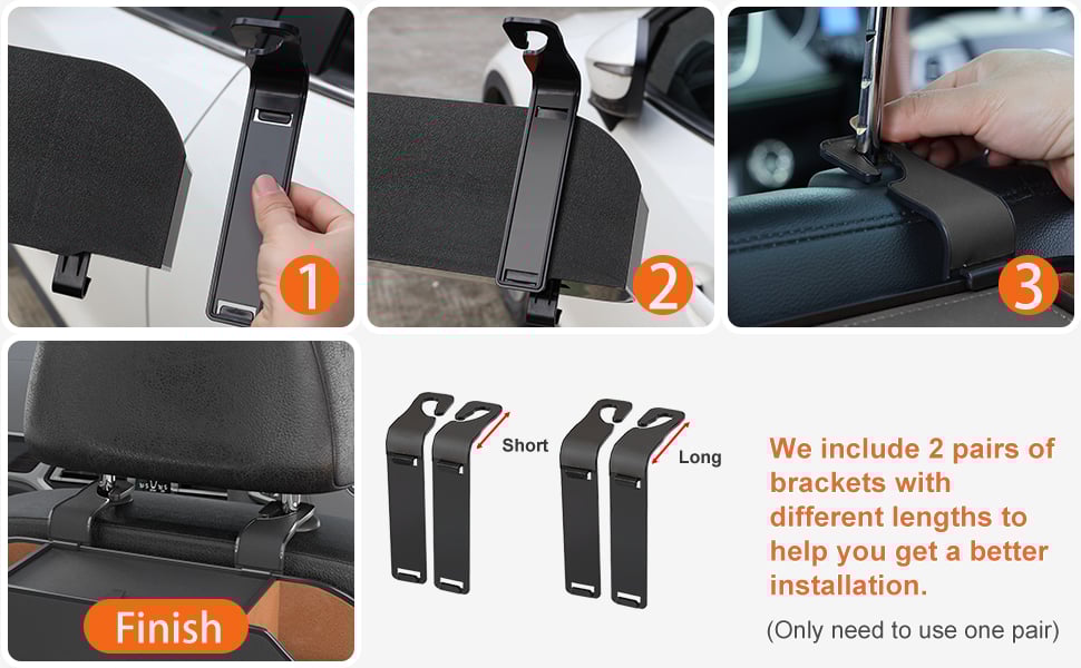 - Hook onto front headrests (no tools!)