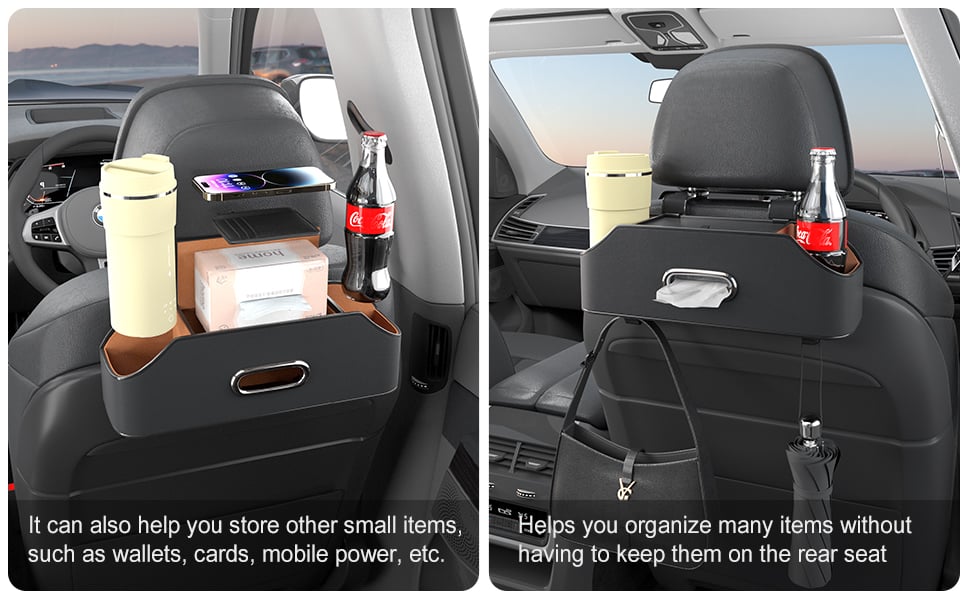- 1x Backseat Organizer (Cup Holders + Tissue Box Slot + Hooks)