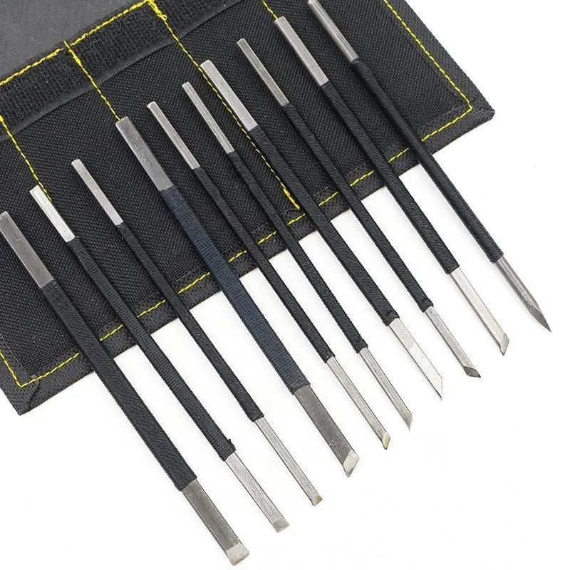 The Carbon Steel Carving Tool Set is a comprehensive collection of precision tools engineered to deliver accuracy, durability, and versatility in wood carving tasks. Each tool in the set is crafted from high-quality carbon steel, known for its strength, edge retention, and ability to maintain sharpness over extended use. This ensures clean and controlled cuts, essential for achieving professional-grade finishes.