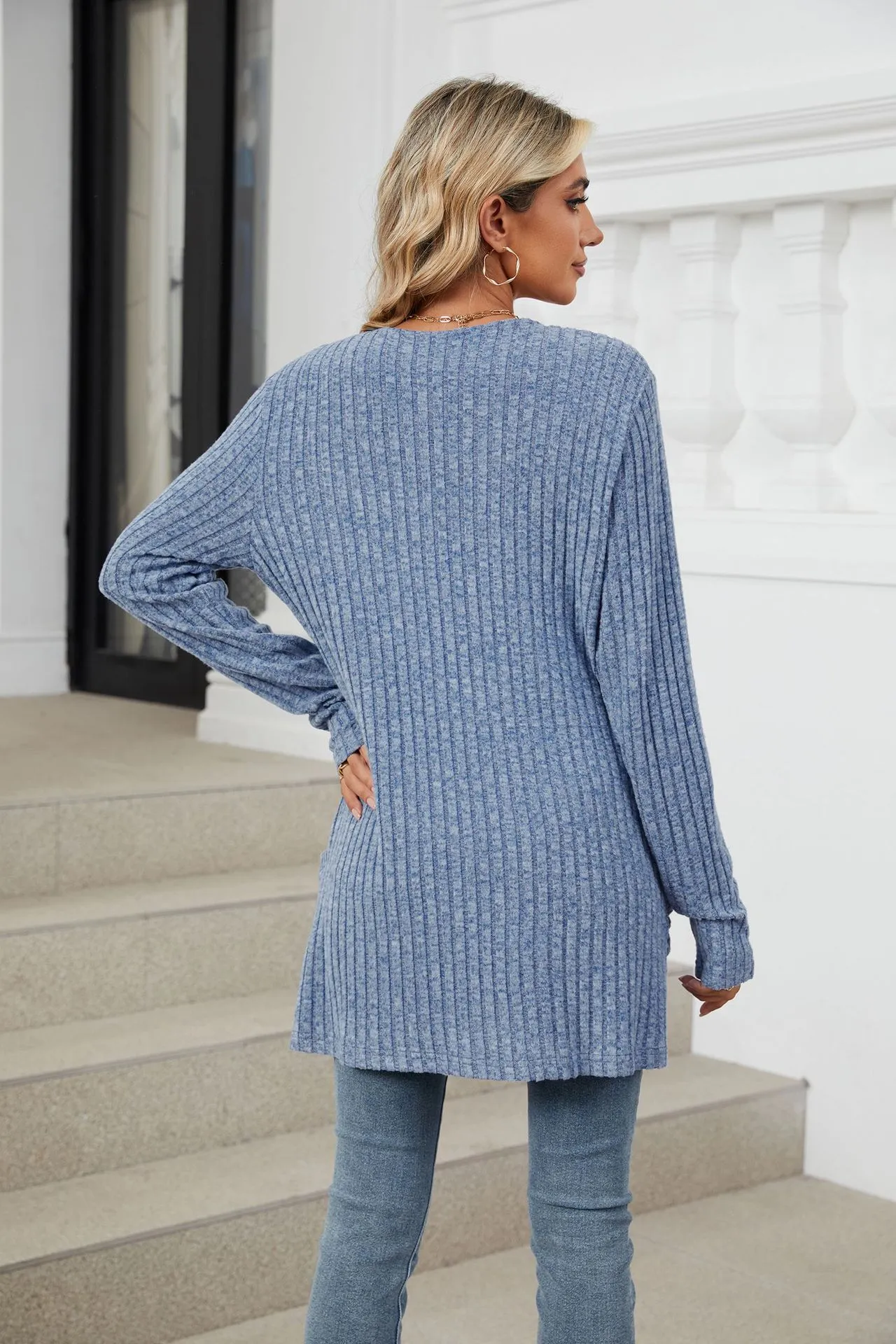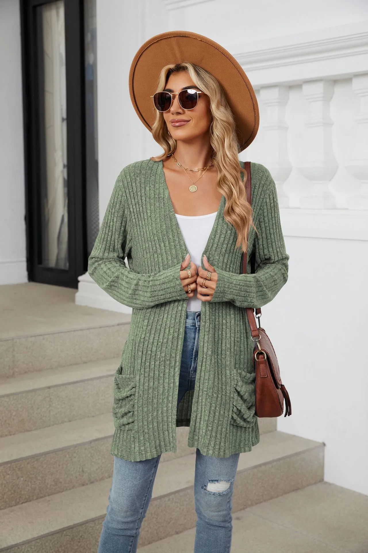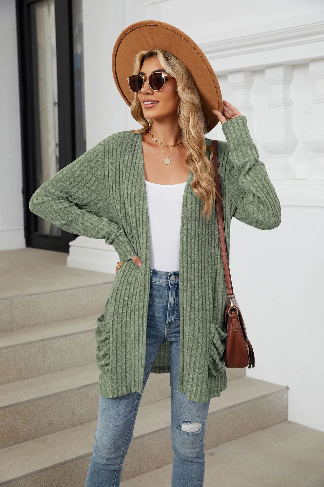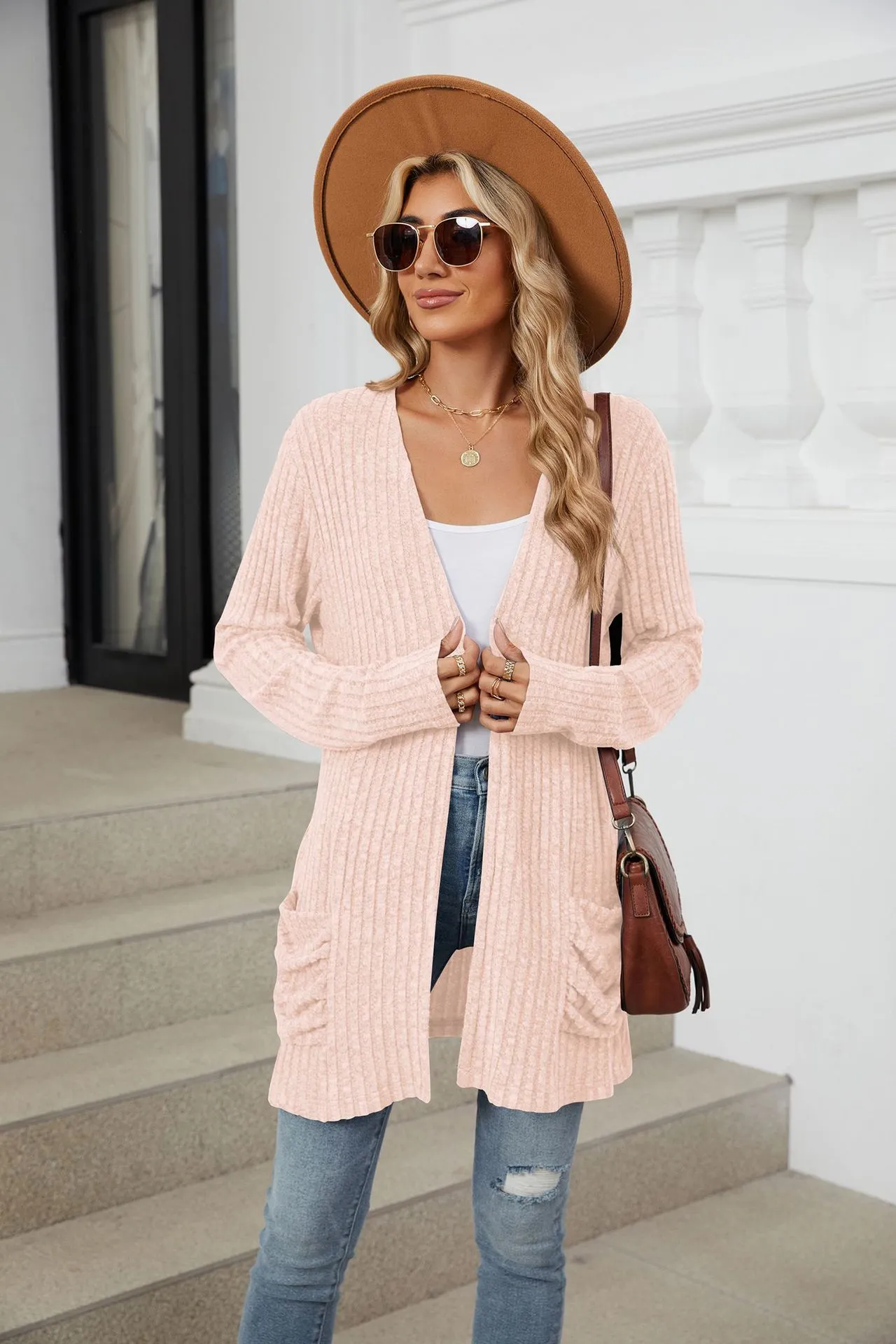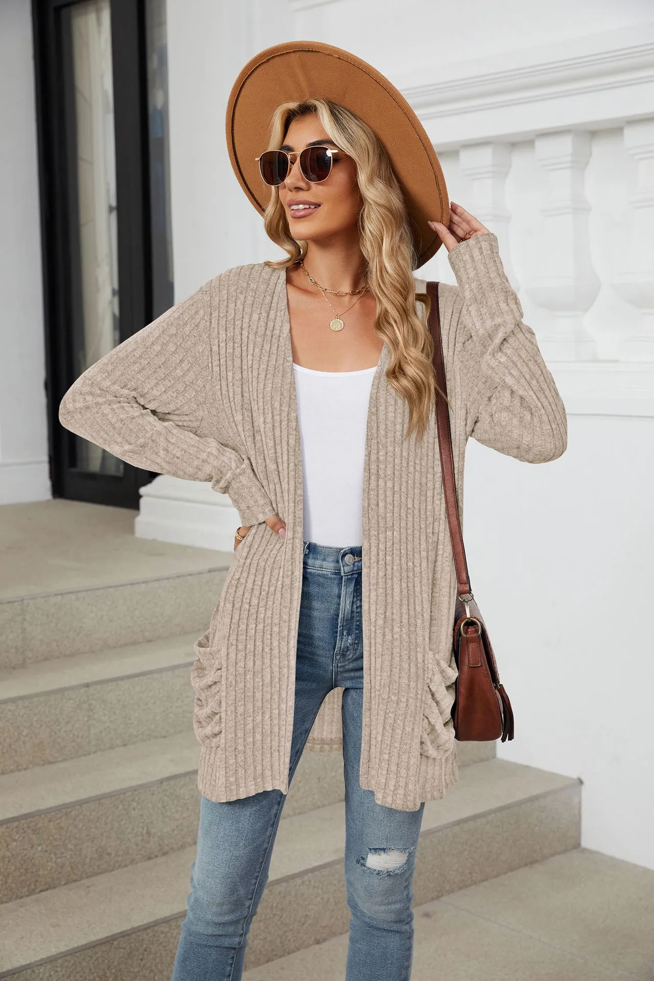 Cárdigan de punto de manga larga con bolsillos de color liso