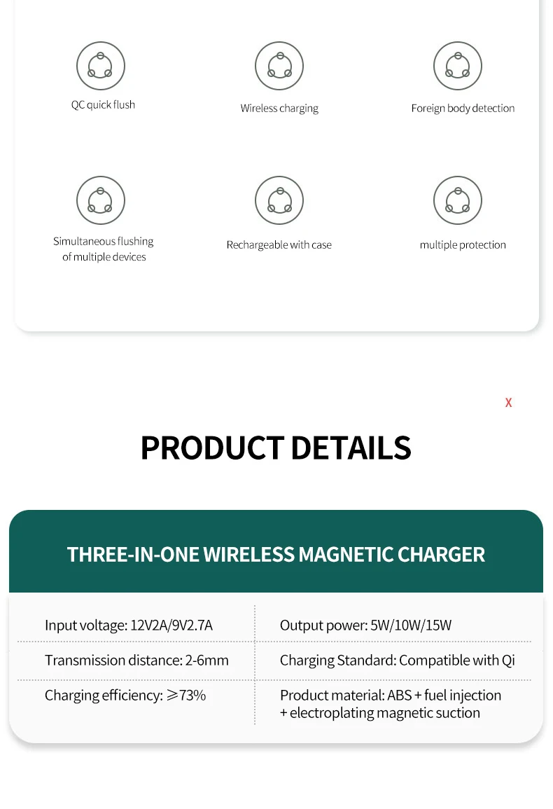Apariencia El soporte de carga inalámbrica magnética 3 en 1 presenta un diseño elegante y moderno que combina funcionalidad y estilo. Está fabricado con materiales duraderos con un acabado mate, lo que garantiza una apariencia premium. Su diseño compacto y ligero lo hace perfecto para cualquier espacio, ya sea tu escritorio, mesita de noche u oficina. La alineación magnética garantiza que tus dispositivos se mantengan seguros en su lugar mientras se cargan.