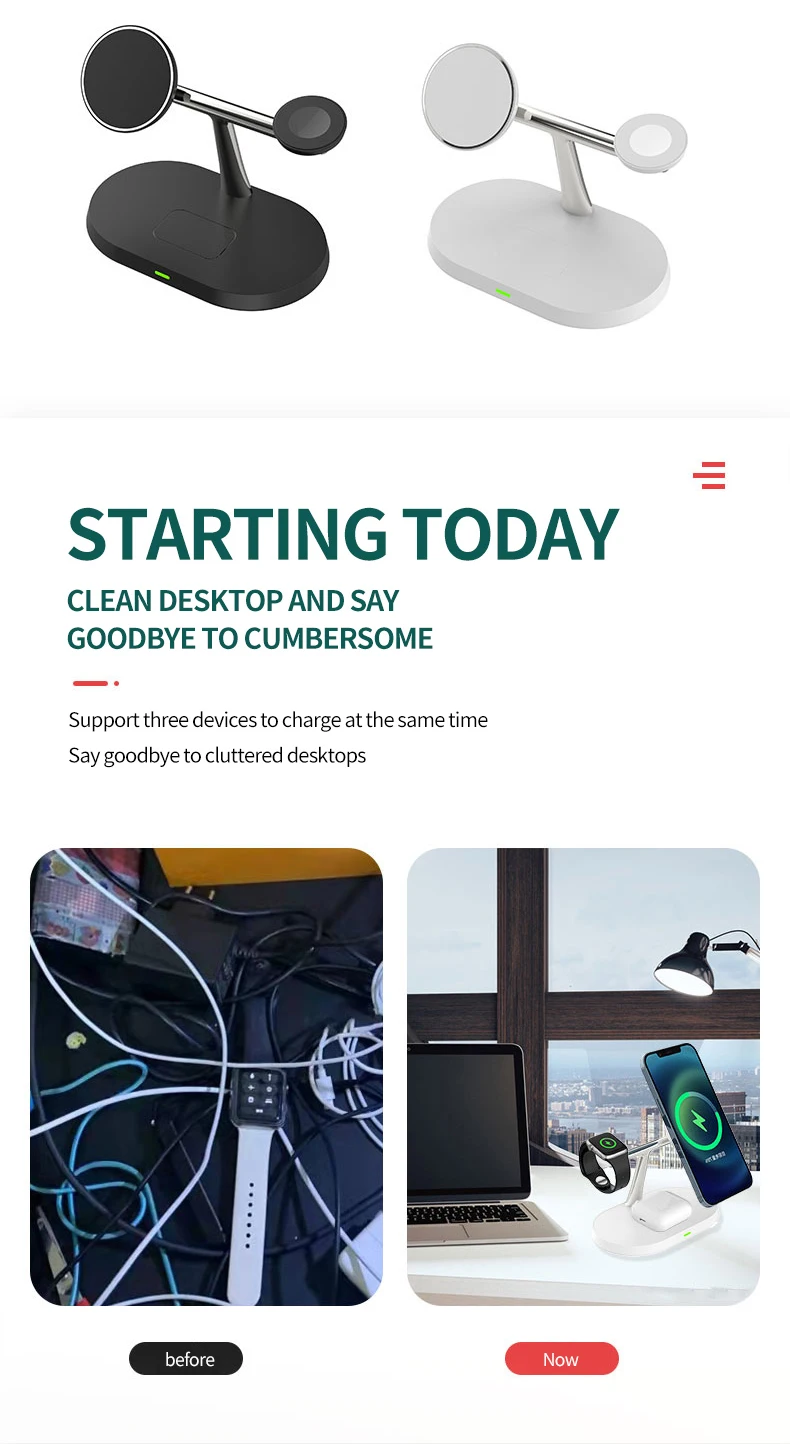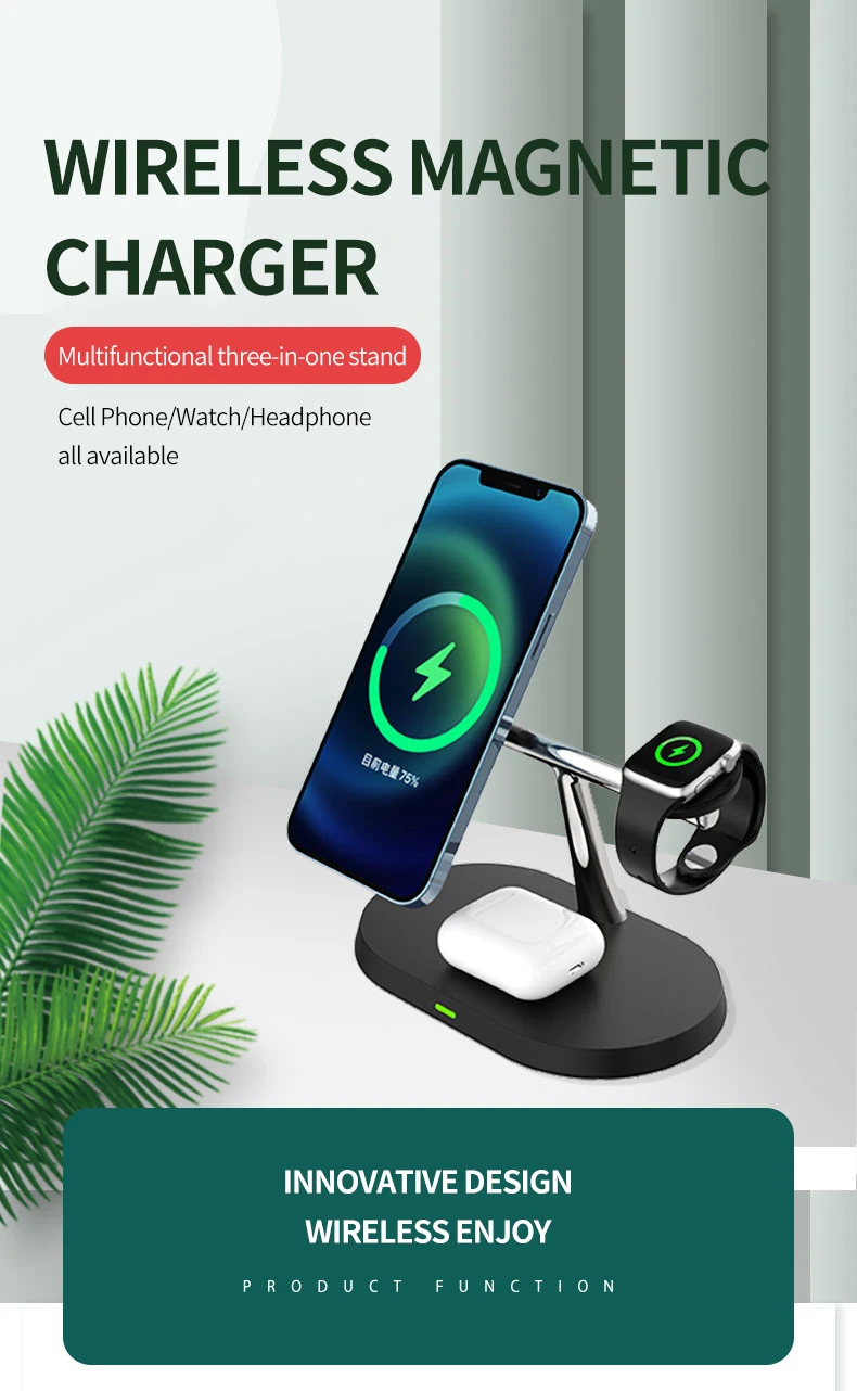 Conclusión El soporte de carga inalámbrico magnético 3 en 1 es un accesorio imprescindible para quienes tengan varios dispositivos Apple. Su diseño elegante, su capacidad de carga rápida y su alineación magnética segura lo convierten en una solución eficiente y elegante para mantener tus dispositivos cargados. Ya sea en casa, en la oficina o de viaje, este soporte de carga ofrece una forma práctica y confiable de cargar tu iPhone, Apple Watch y AirPods.