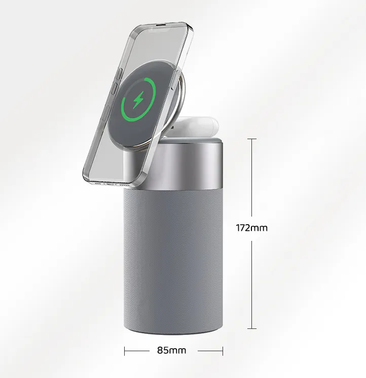 Al consolidar tus necesidades de carga en un solo soporte, el cargador inalámbrico 3 en 1 ayuda a reducir el desorden de cables. Esta elegante y compacta estación de carga elimina la necesidad de cables y adaptadores desordenados, ofreciendo una configuración de carga más limpia y organizada que ahorra espacio y mejora la estética de tu escritorio o mesita de noche.