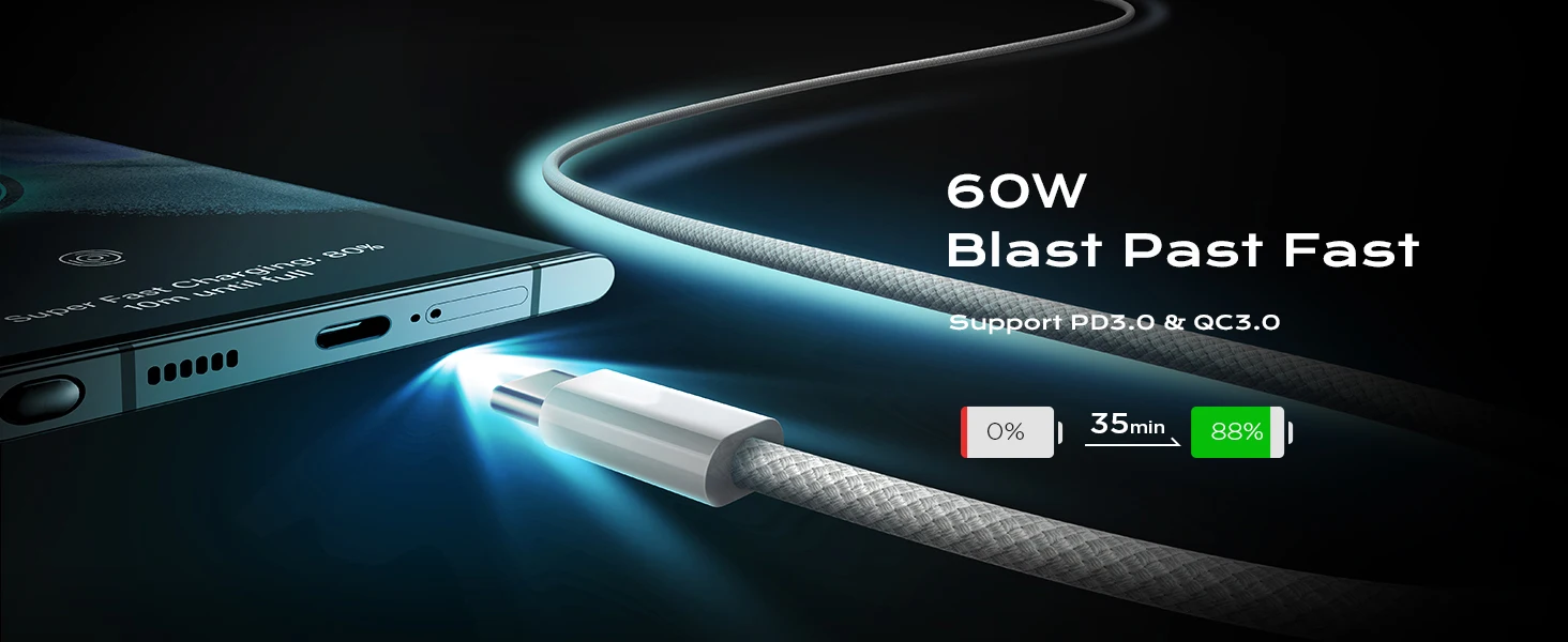 Este cable USB-C a USB-C admite carga rápida PD3.0/QC3.0/QC4.0 de hasta 65 W máx. (20 V/3,25 A) / 60 W (20 V/3 A) con adaptadores USB-C Power Delivery de 30 W, 45 W y 60 W.