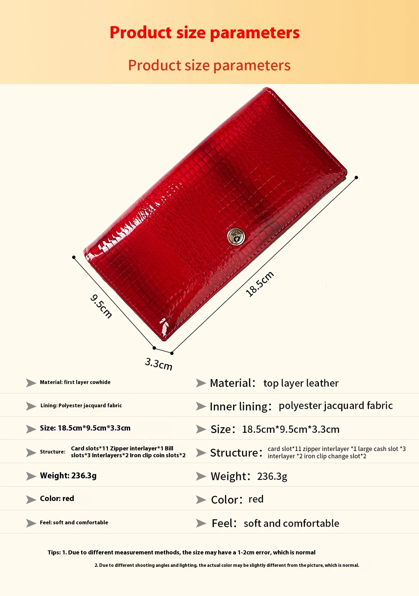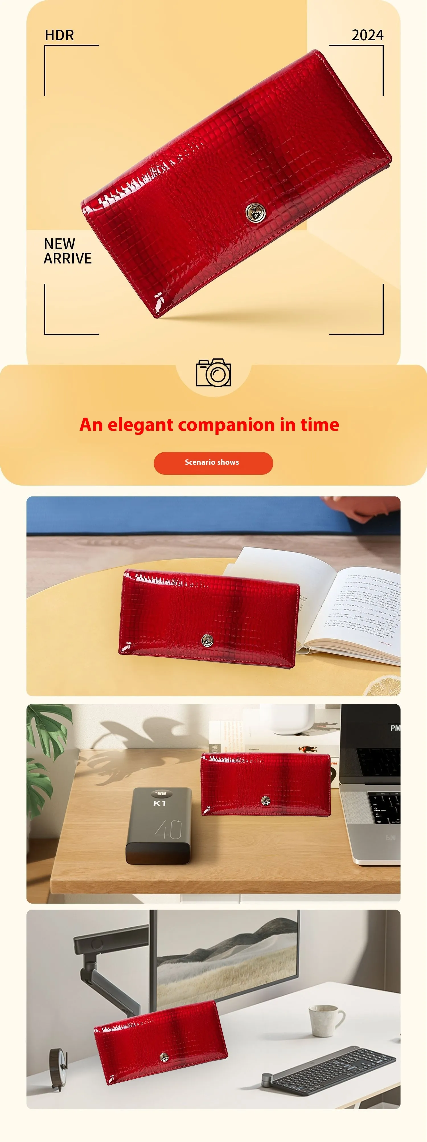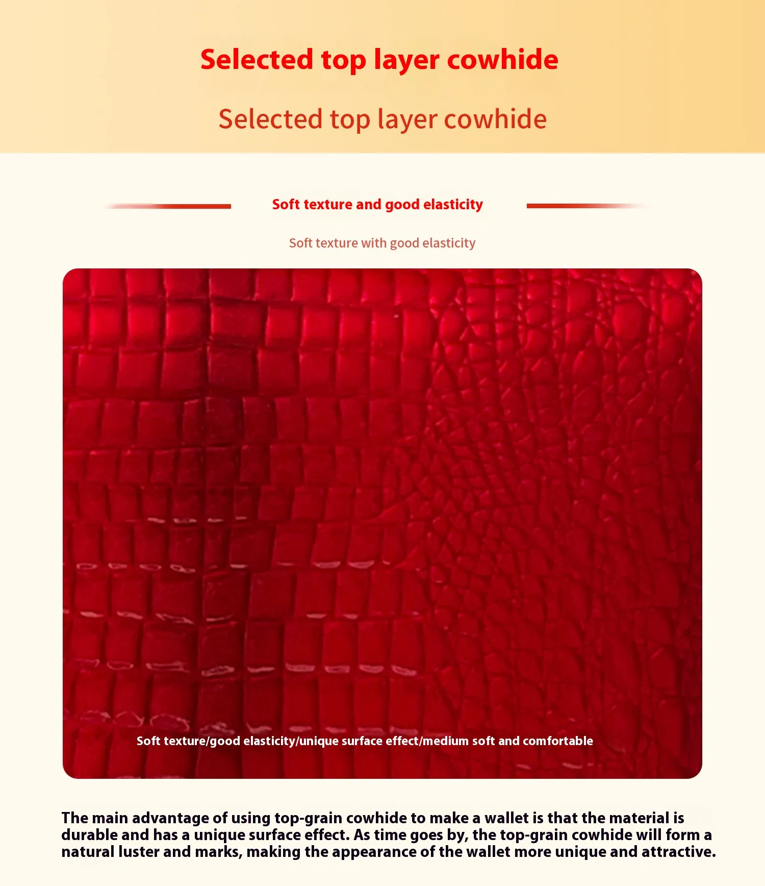 Elaborada con el mejor charol, esta billetera presenta un patrón de cocodrilo realista que irradia una sensación de lujo y sofisticación. El acabado brillante no solo realza el rojo vibrante, sino que también proporciona durabilidad y resistencia a rayones y rozaduras, asegurando que su billetera se mantenga impecable.