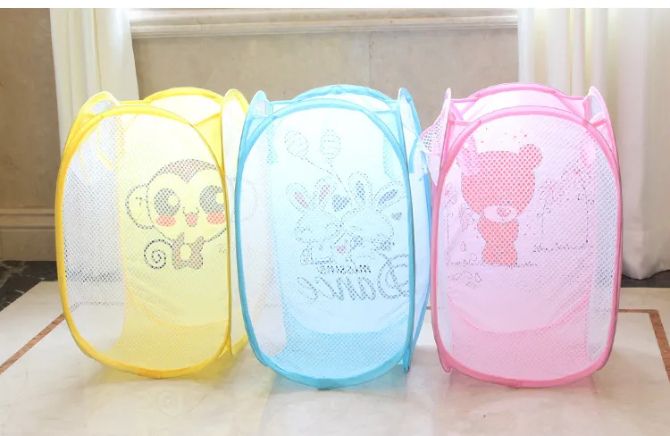 Summary: cute cartoon print, mostly color, three-sided grid, store dirty clothes, play