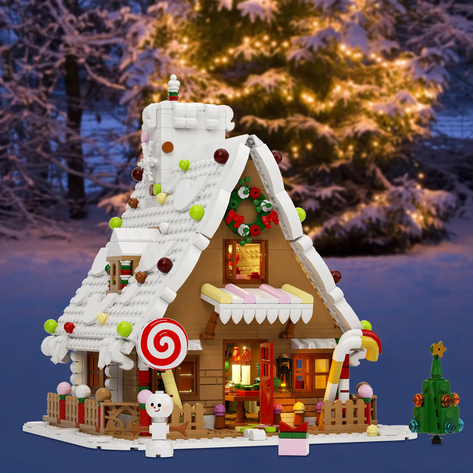 - Detalles inspirados en las fiestas: Incluye bastones de caramelo, coronas, techos cubiertos de nieve y luces de cadena.