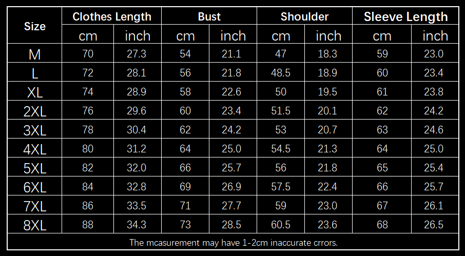 Size: M, L,XL,2XL,3XL,4XL,5XL,6XL,7XL,8XL